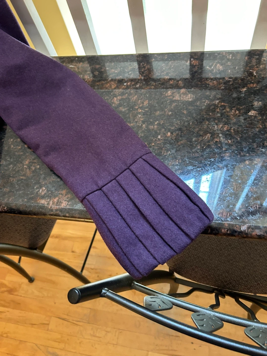 A stylish Vero Moda wool coat in a lovely shade of purple! This coat is a size large and features a unique collar design and pleated sleeve detail. It's perfect for adding a touch of elegance to your wardrobe on cooler days