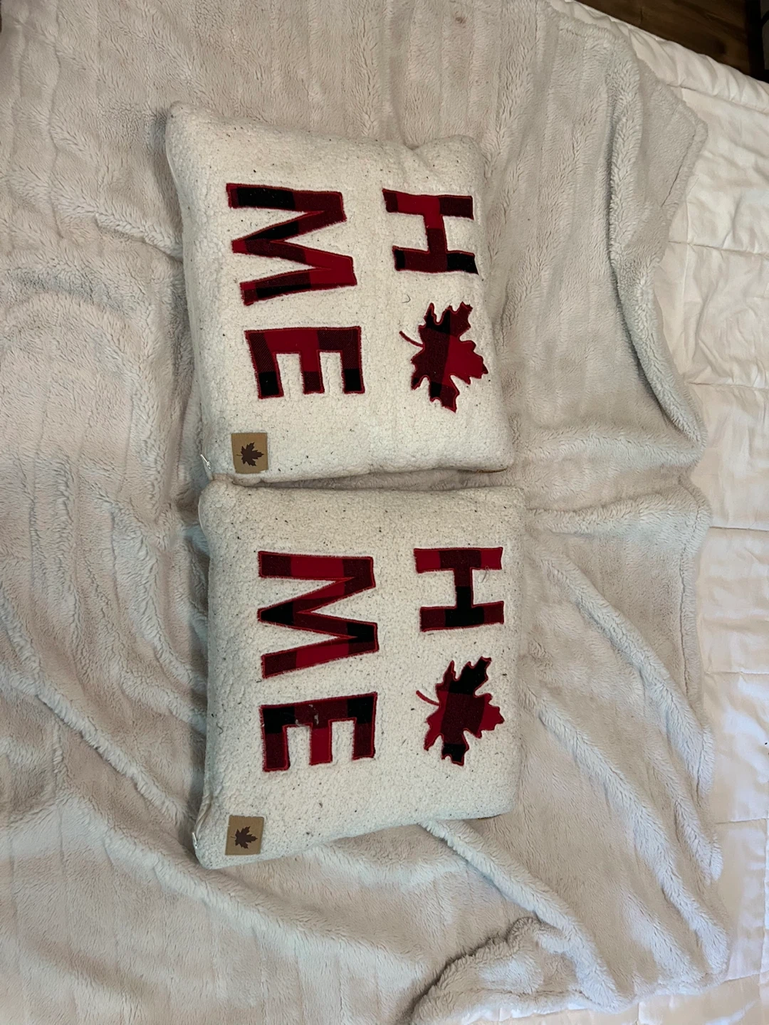 Selling a set of two decorative pillows with a cozy "Home" design. They feature a soft, textured fabric and a cute maple leaf detail. Perfect for adding a touch of Canadian charm to your living space