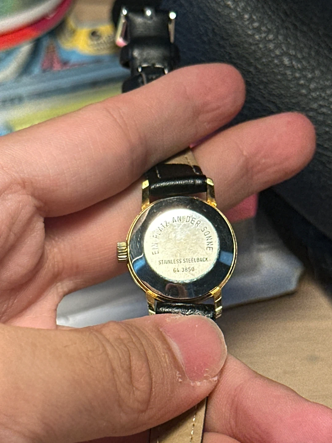 Selling a Bergana watch. It has a gold-tone case and a black leather strap. The watch face says '17 Rubis Incabloc' on it. The back of the watch says 'Stainless Steelback' and '64 3850'.