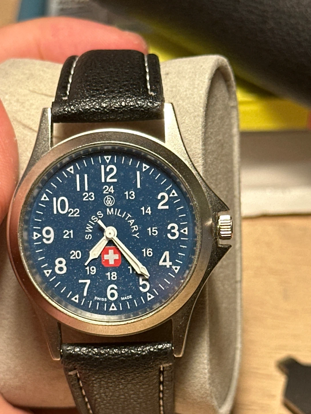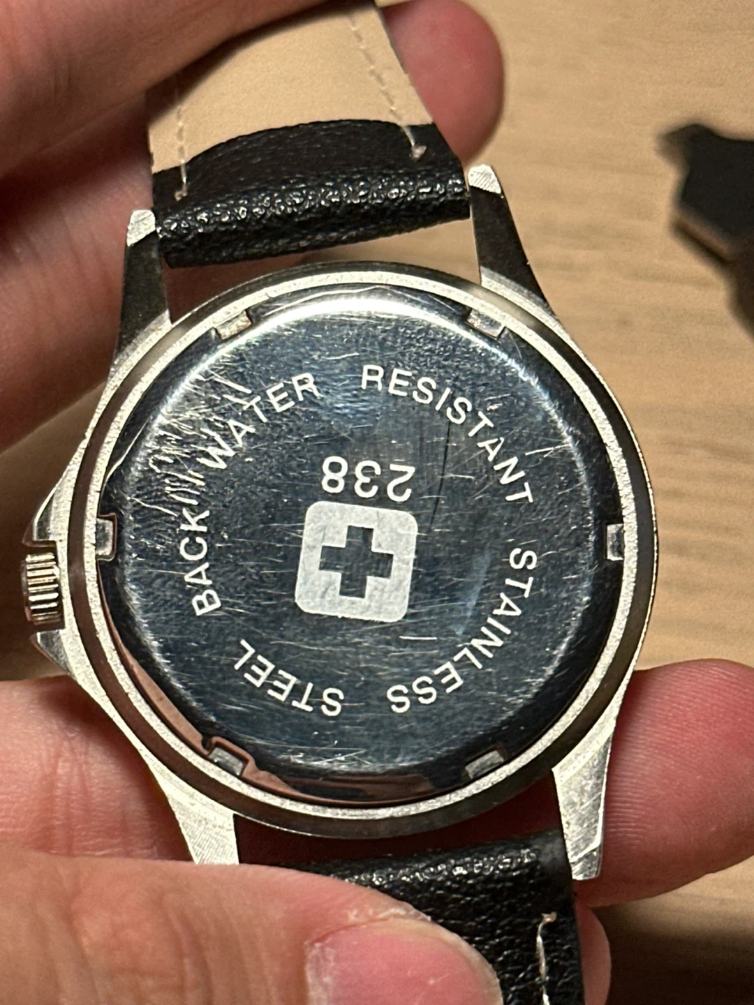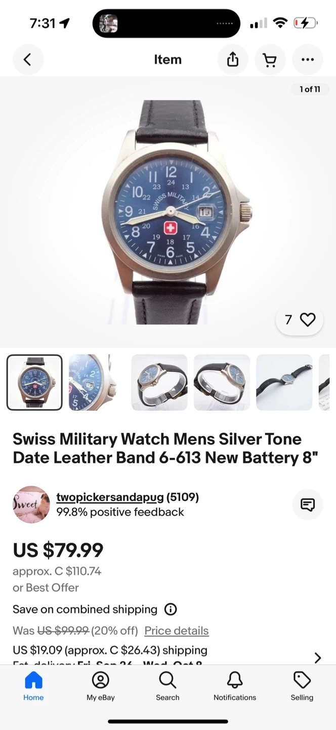 Selling a Swiss Military watch with a silver tone and a date display. It has a leather band and a new battery. The watch is water resistant and made of stainless steel. Originally listed for US$79.99.