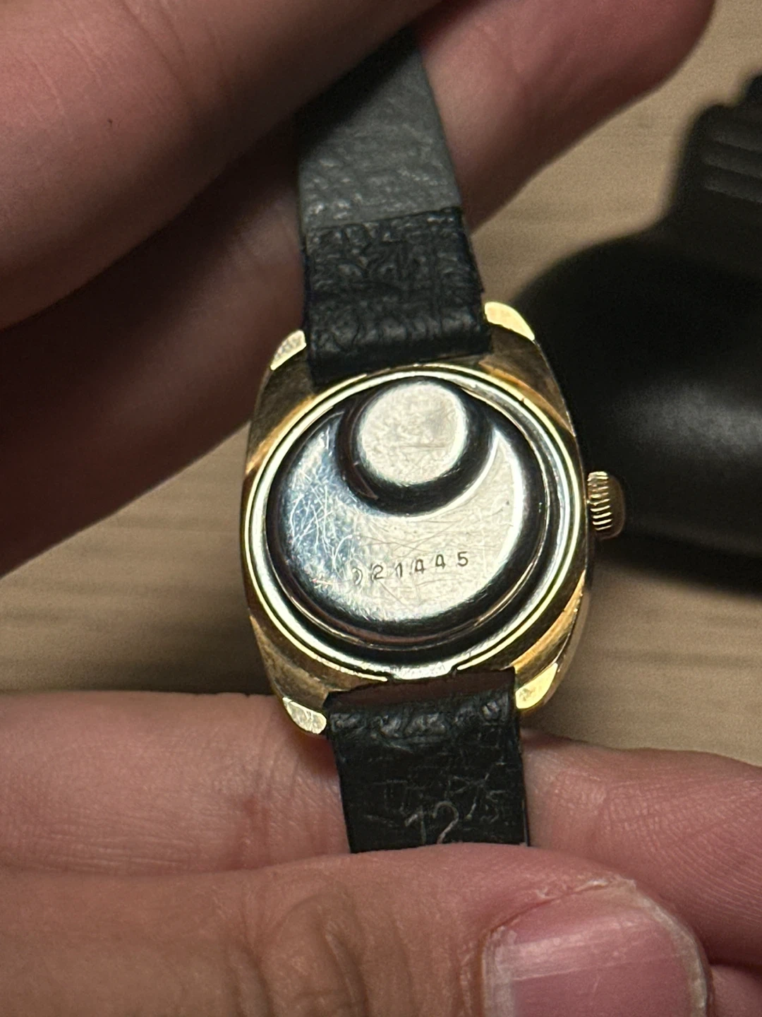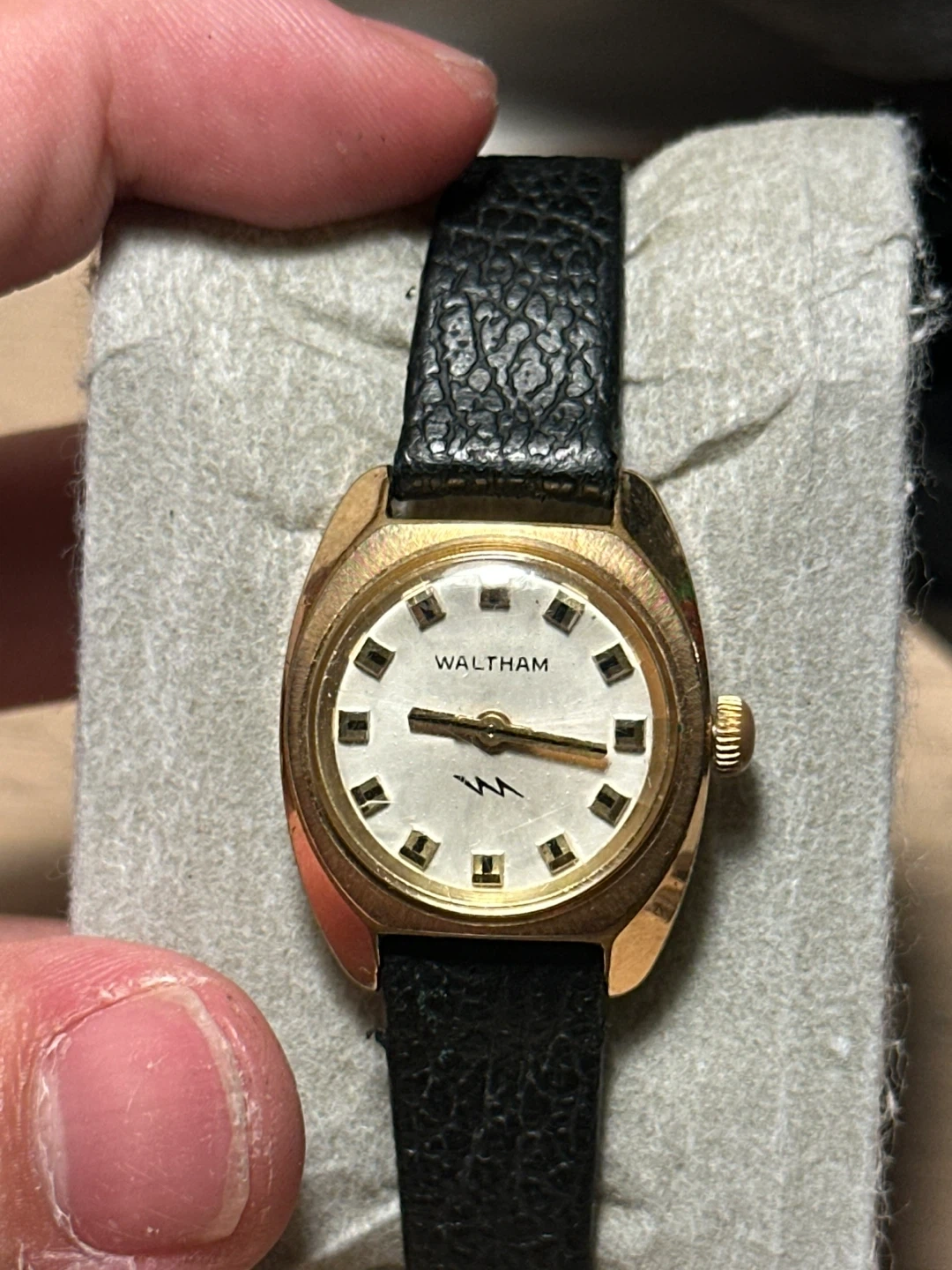 Selling a vintage Waltham ladies watch. The watch has a gold-tone case and a black leather strap. The face is white with gold hands. It's a lovely piece!