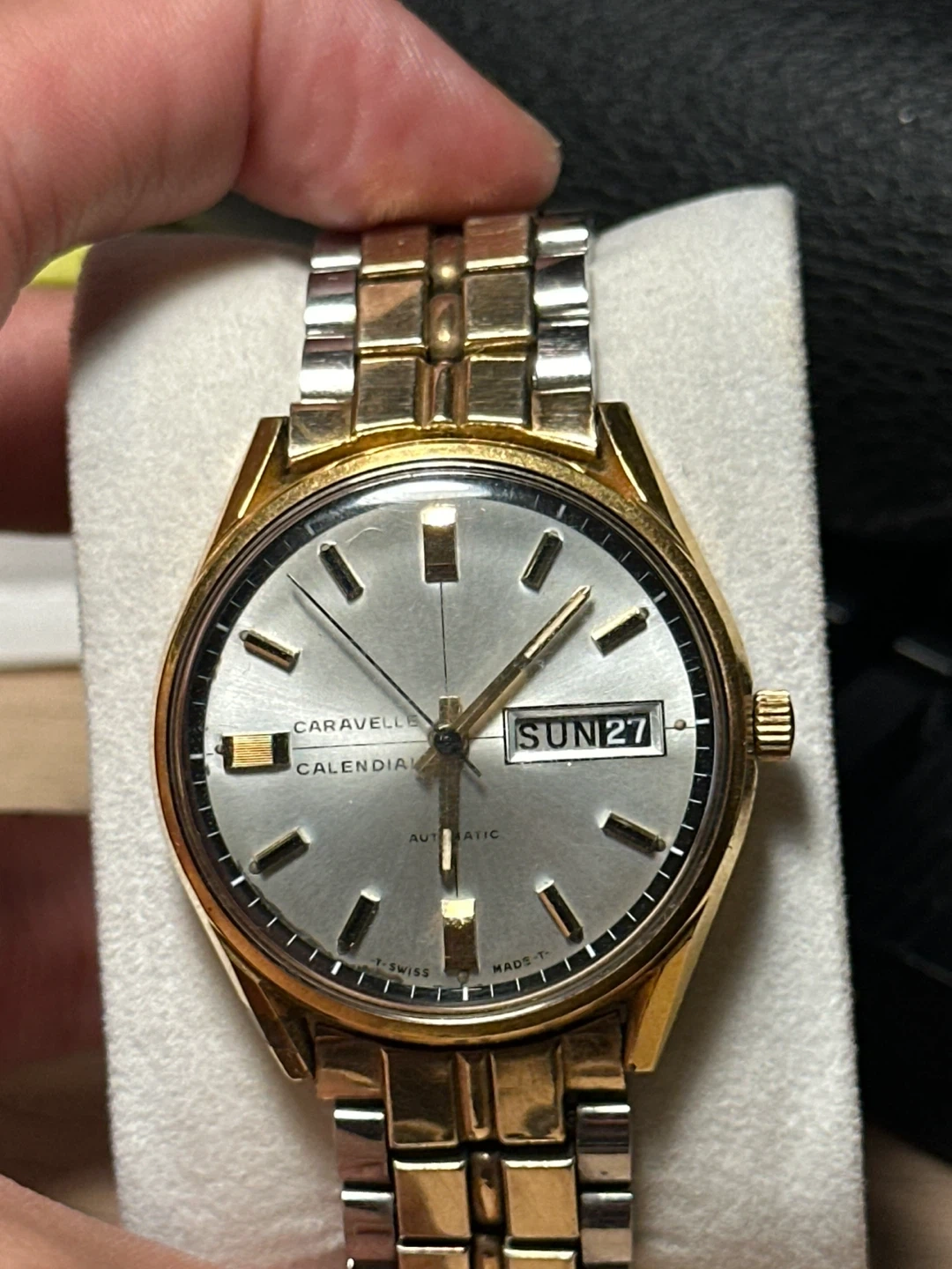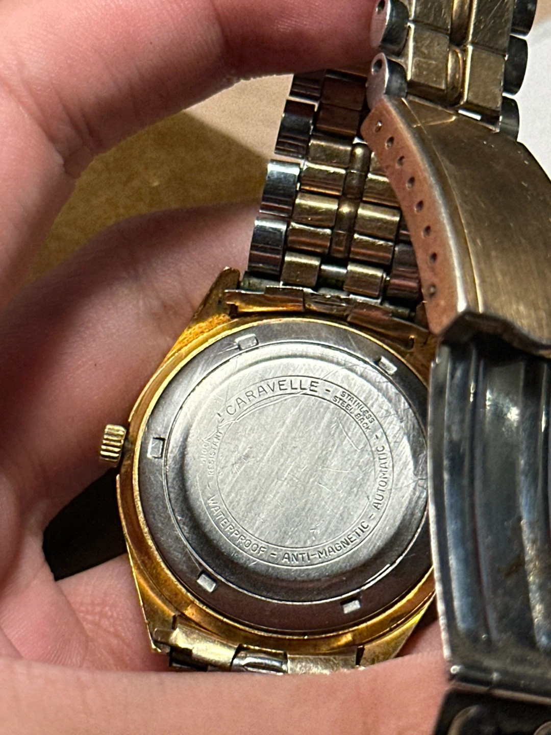 Selling a Caravelle automatic calendar watch. It features a stainless steel back and is waterproof and anti-magnetic. The watch displays the day of the week and date. A stylish timepiece for everyday wear