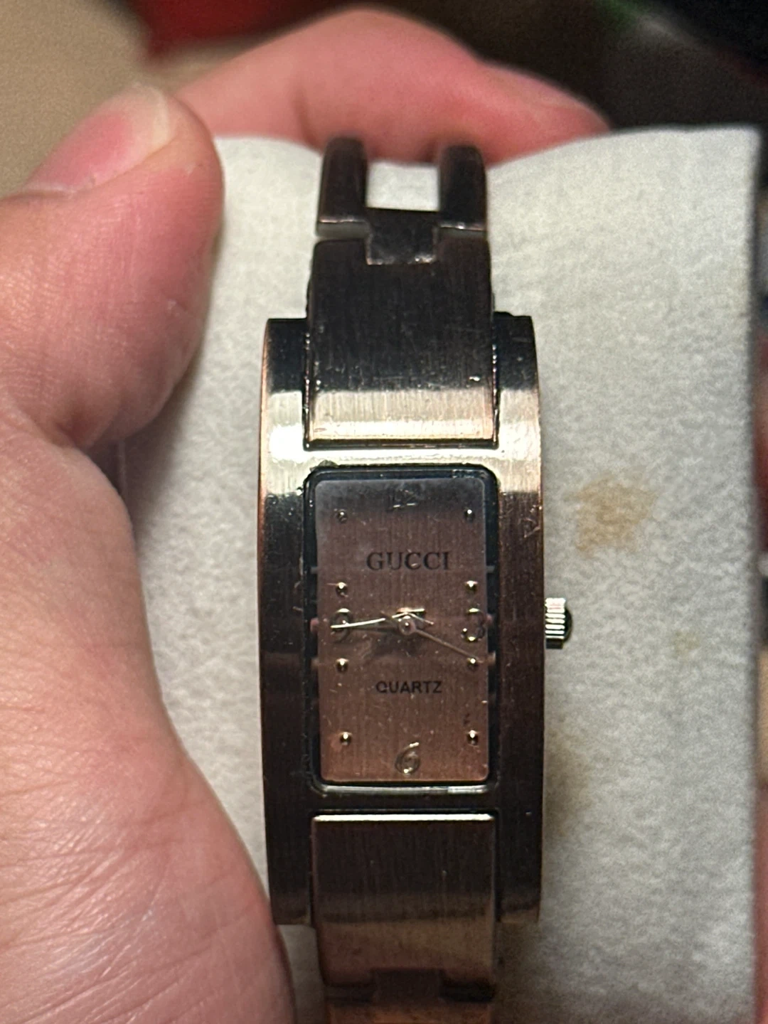 Selling a Gucci Quartz ladies watch. It's water resistant and has a stainless steel back. A stylish and classic timepiece!