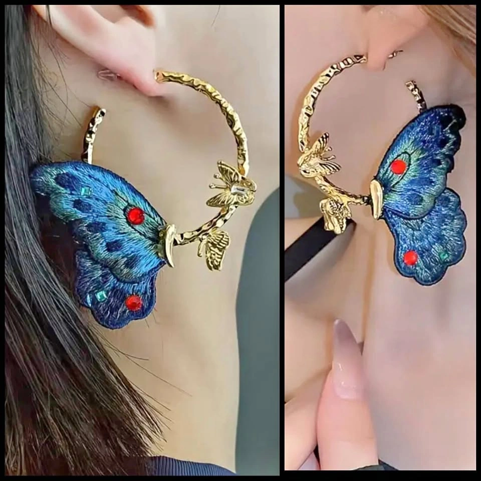 Brand new gold tone hoop earrings with beautifully embroidered blue butterfly design. π¦ Gorgeous statement piece and beautiful for the summer βοΈ Fairycore vibes! Let me know if you need more information or photos. Price is firm.