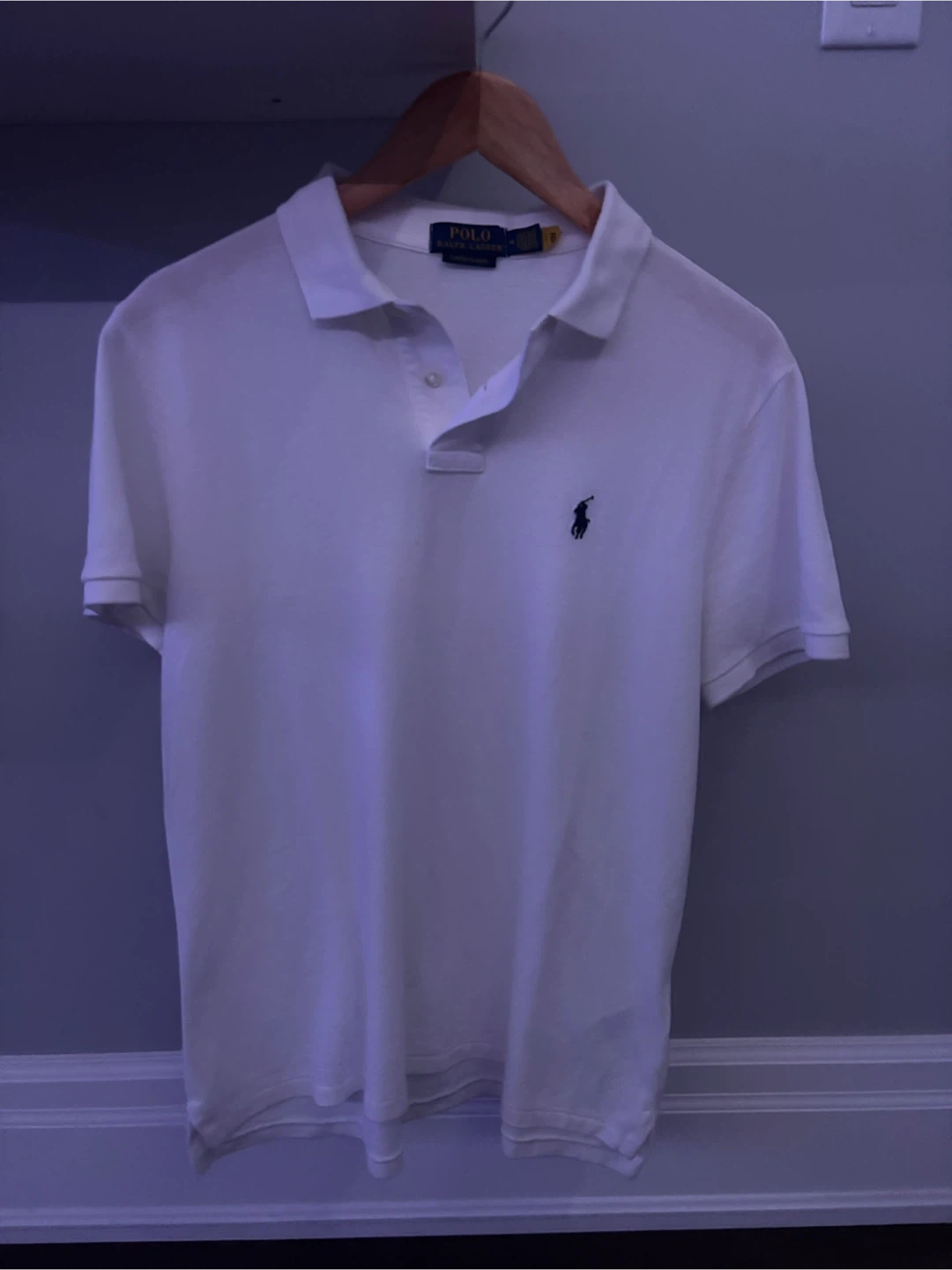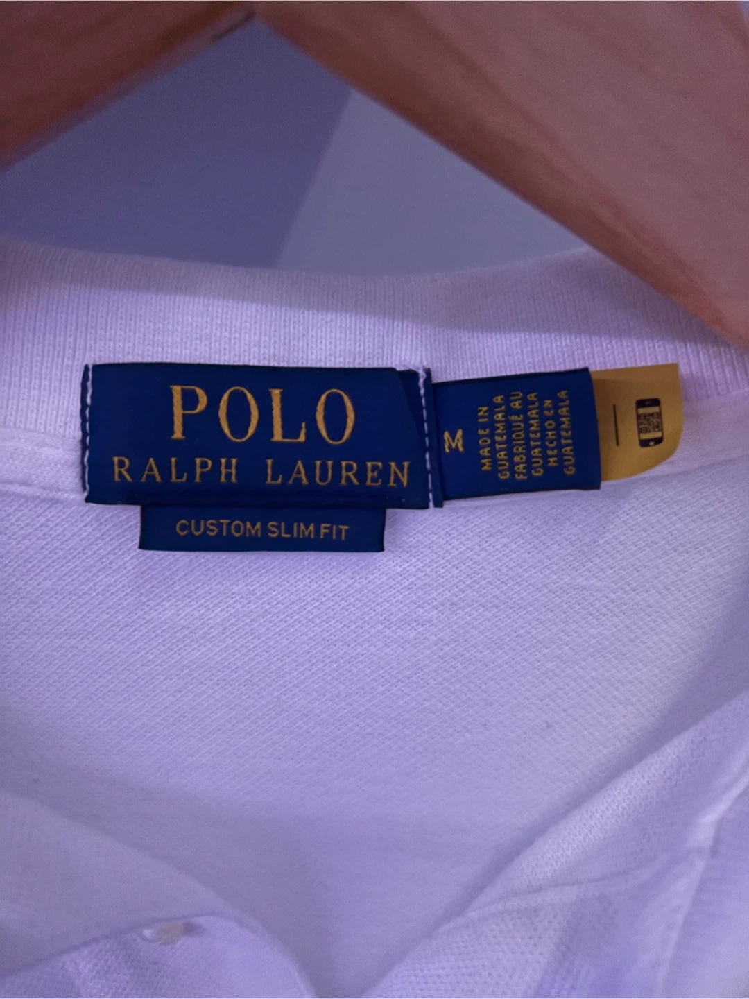 Selling a Polo Ralph Lauren white polo shirt in size medium! It's a custom slim fit, perfect for a clean and stylish look. The material feels great and it's in good condition. A classic piece for any wardrobe!