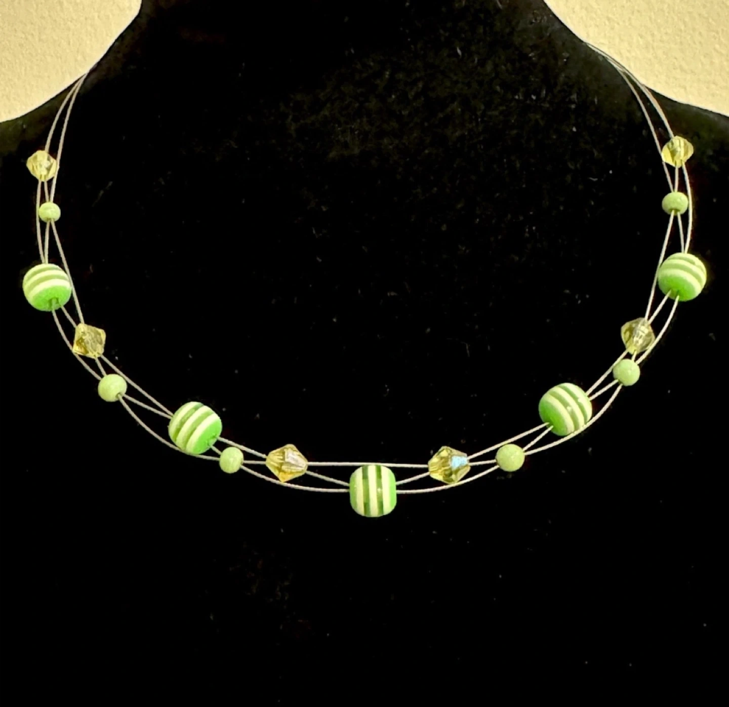 This is a cute beaded necklace with green and yellow beads. It has a triple strand design with different sized beads. Perfect for adding a pop of colour to any outfit!