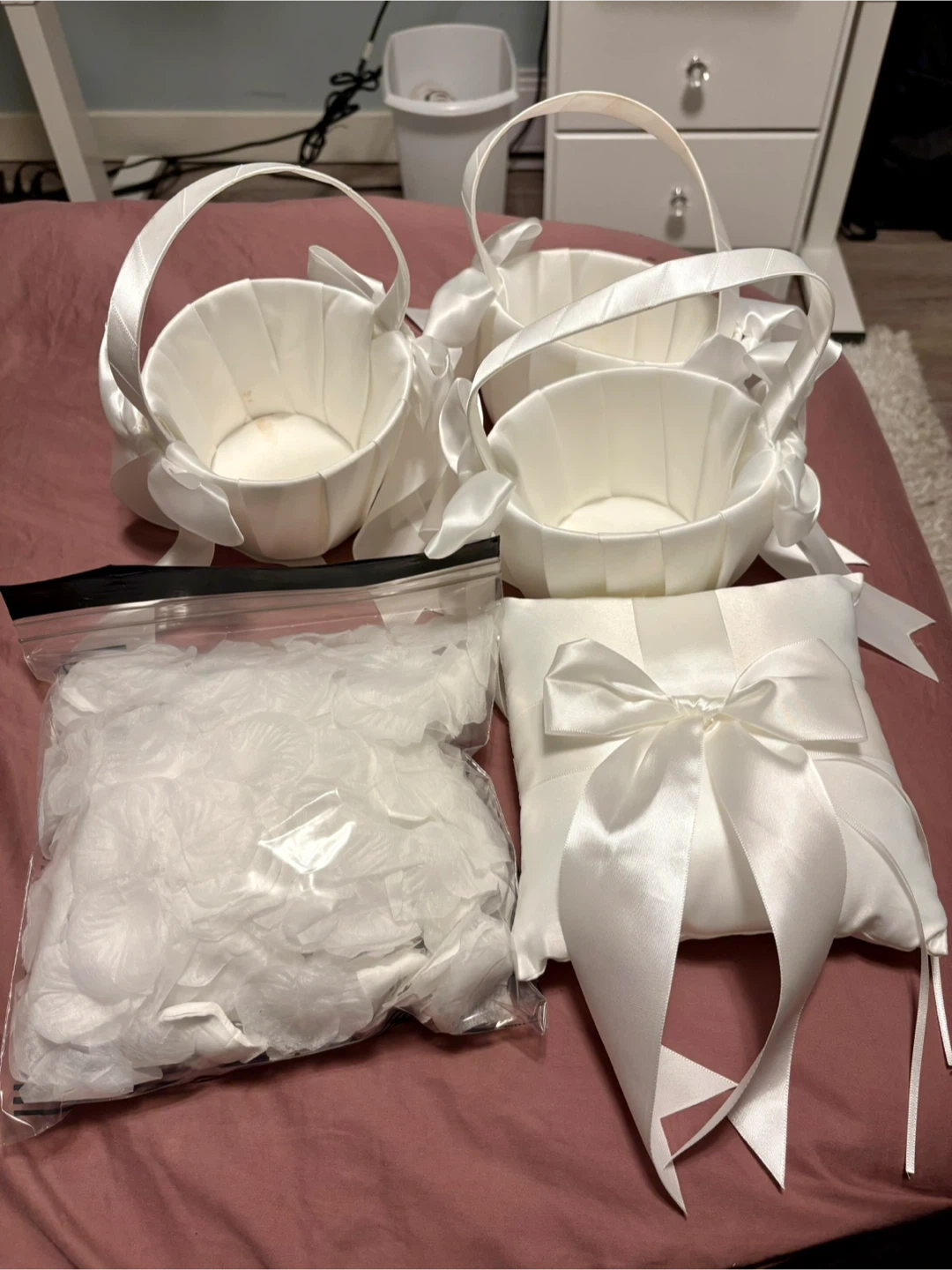 Selling a set of wedding accessories! Included are three flower girl baskets, a bag of white flower petals, and a ring bearer pillow. All in great condition and ready for your special day!