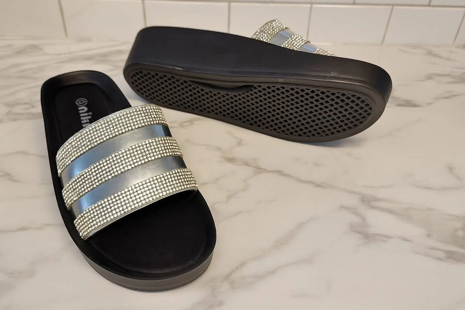 Step into glam with these dazzling bling slide sandals! 💎 Featuring three rows of shimmering rhinestones on sleek black straps, these slides are both comfy and fabulous. Perfect for casual outings, beach days, or adding a little razzle-dazzle to your everyday strut. 💃 Lightweight & comfy 🖤 Stylish black platform sole 🌟 Sparkly straps to turn heads 🌈 Gently worn, excellent condition Get your sparkle on—grab these before they glitter away! Size 6.5-7 (37)