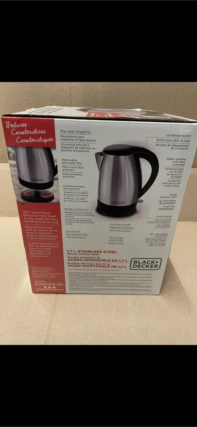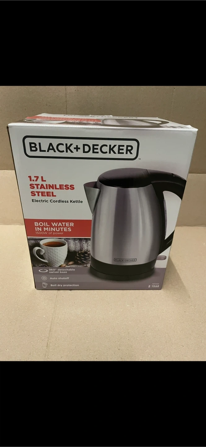 Selling a brand new, unopened Black+Decker 1.7L stainless steel electric cordless kettle! It boils water in minutes and features boil-dry protection. Key features: - Stay-open hinged lid - Removable anti-scale filter - Durable stainless steel interior - Exterior durable - Boil/dry protection - Automatic shutoff - Cord storage - Water window with level indicator