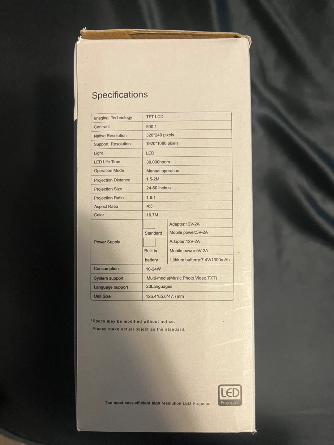 Selling an LED projector. It's a cost-efficient, high-resolution projector. Specifications: - Imaging Technology: TFT LCD - Native Resolution: 320*240 pixels - Support Resolution: 1920*1080 pixels - LED Life Time: 30,000 hours - Projection Distance: 1.5-2M - Projection Size: 24-60 inches - Aspect Ratio: 1.6:1 - Color: 16.7M - Unit Size: 126.4*85.8*47.7mm