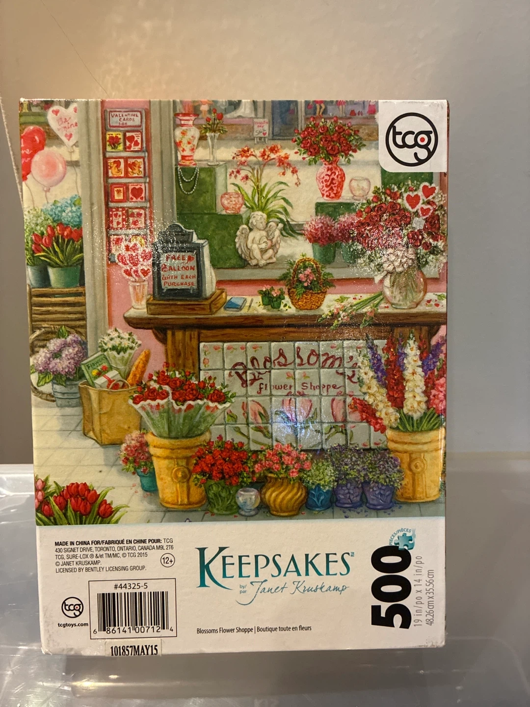 Selling a TCG Keepsakes 500-piece puzzle featuring Janet Kruskamp's 'Blossoms Flower Shoppe' design Perfect for puzzle enthusiasts aged 12 and up