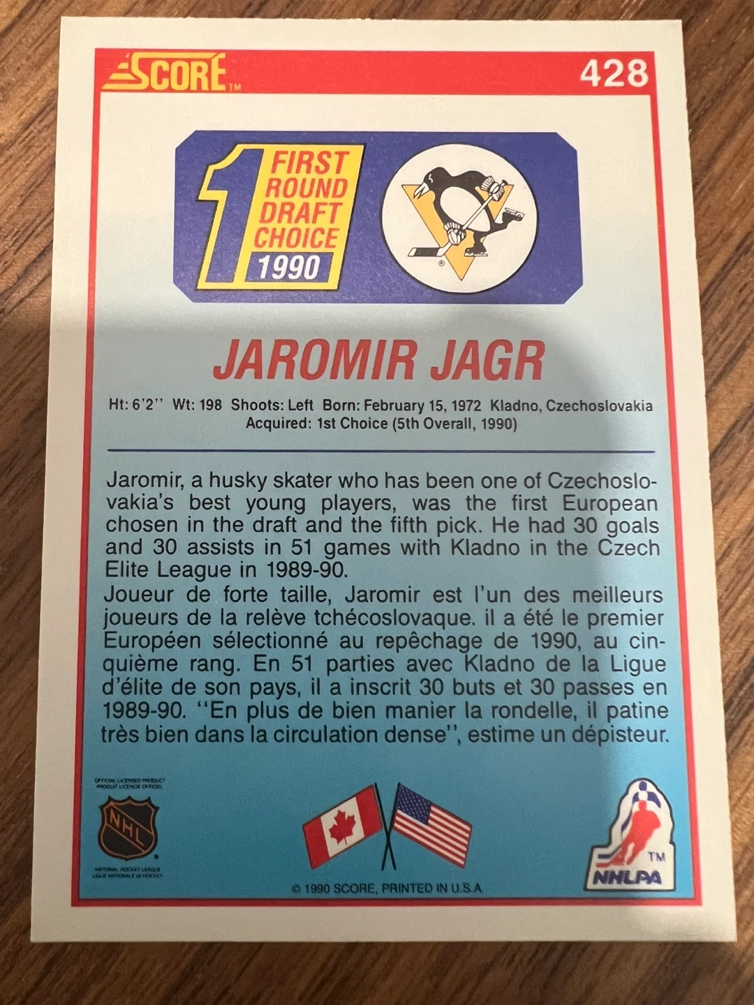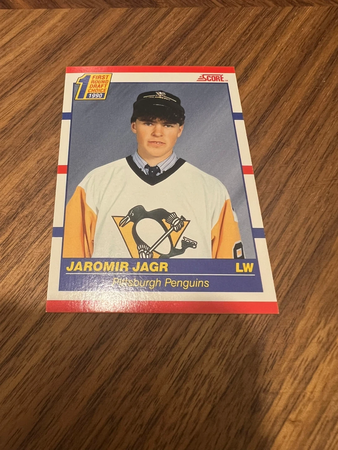 Selling a Jaromir Jagr 1990 Score hockey card. The card features Jaromir Jagr, drafted in 1990, playing for the Pittsburgh Penguins. A great addition for any hockey card collector! Card is NM