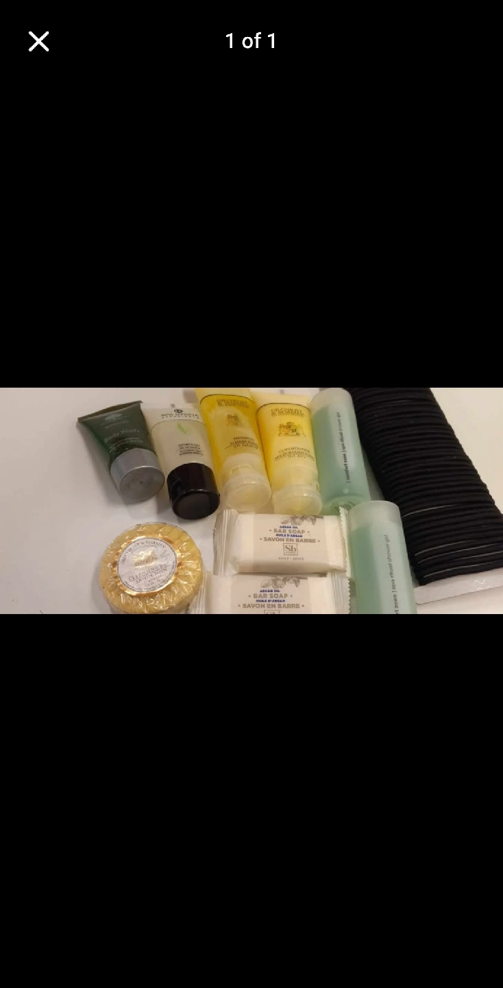 Groseley & Scagen travel size toiletries set. Includes body wash, shower gel, shampoo, conditioner, bar soap and hair ties