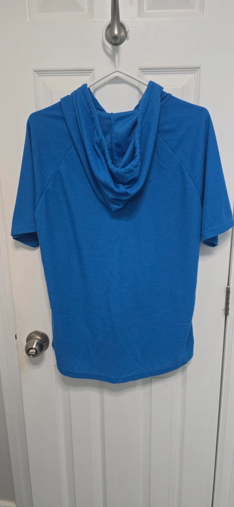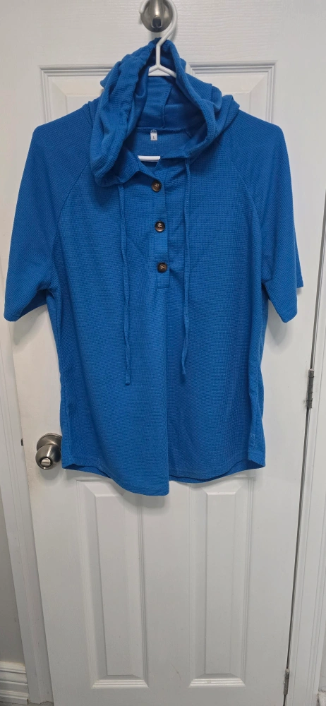 A comfy blue short sleeve hoodie, perfect for those in-between weather days! It's a size L and features a hood and button detailing on the front. Great for casual wear!