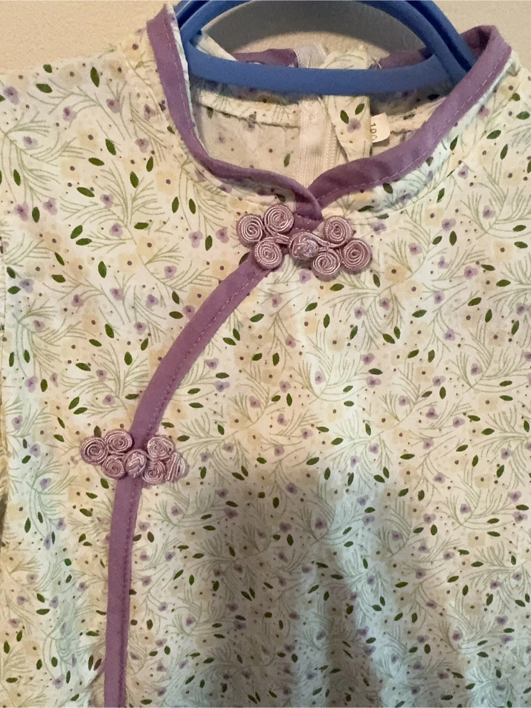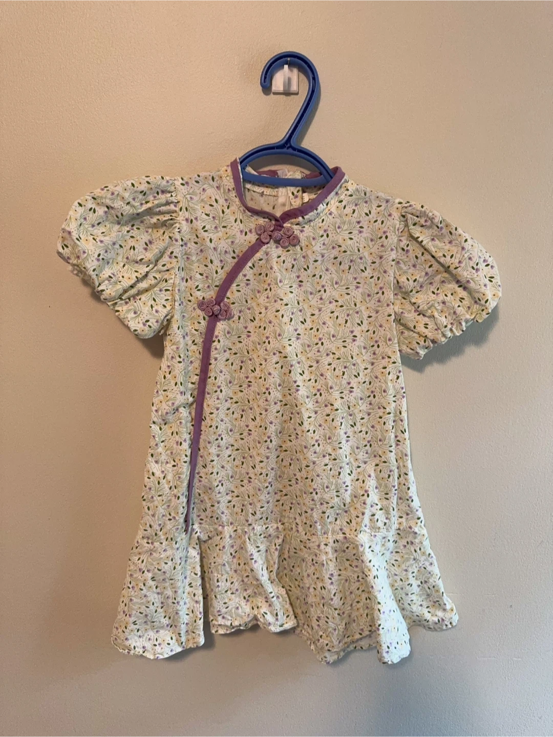 100% Cotton Chinese Traditional Cheongsam Dress. It's in great condition and perfect for a little one. The dress features a unique design with decorative knot buttons and a ruffled hem.