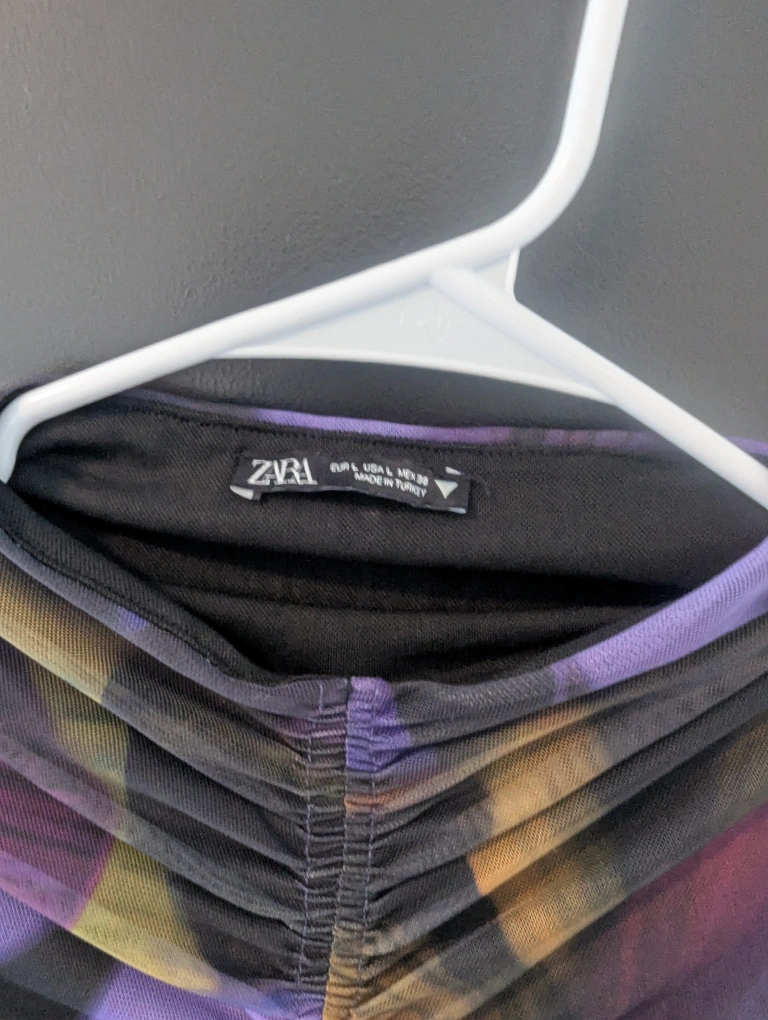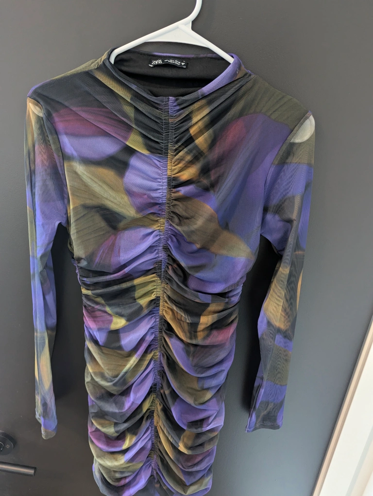 Brand new, never worn! This stunning Zara ruched mesh dress is labeled a size L but fits snug, so it would also be perfect for someone who typically wears a size M. Unfortunately, it's a bit tight on me, so I never got the chance to wear it. It’s a super stylish and eye-catching piece — perfect for a night out or special occasion!