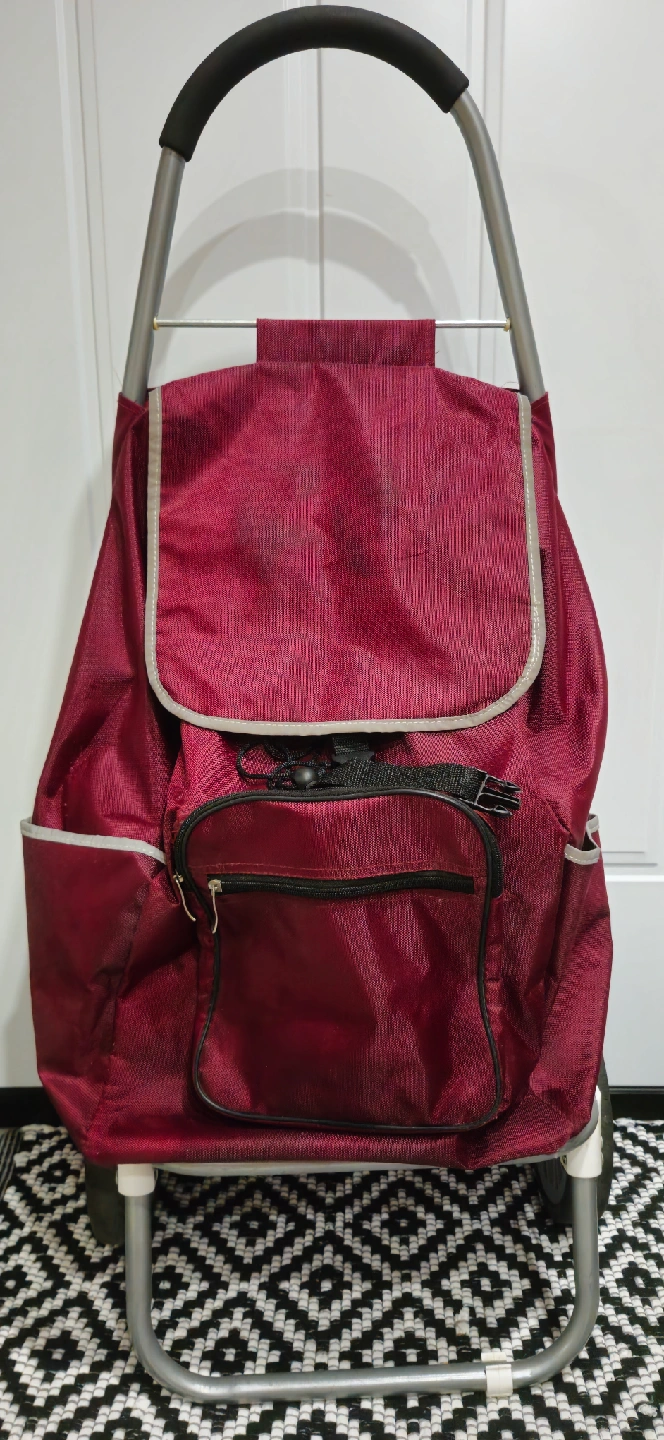 Maroon shopping trolley cart. It has a sturdy metal frame and a spacious fabric bag with multiple pockets. Perfect for carrying groceries or other items with ease!