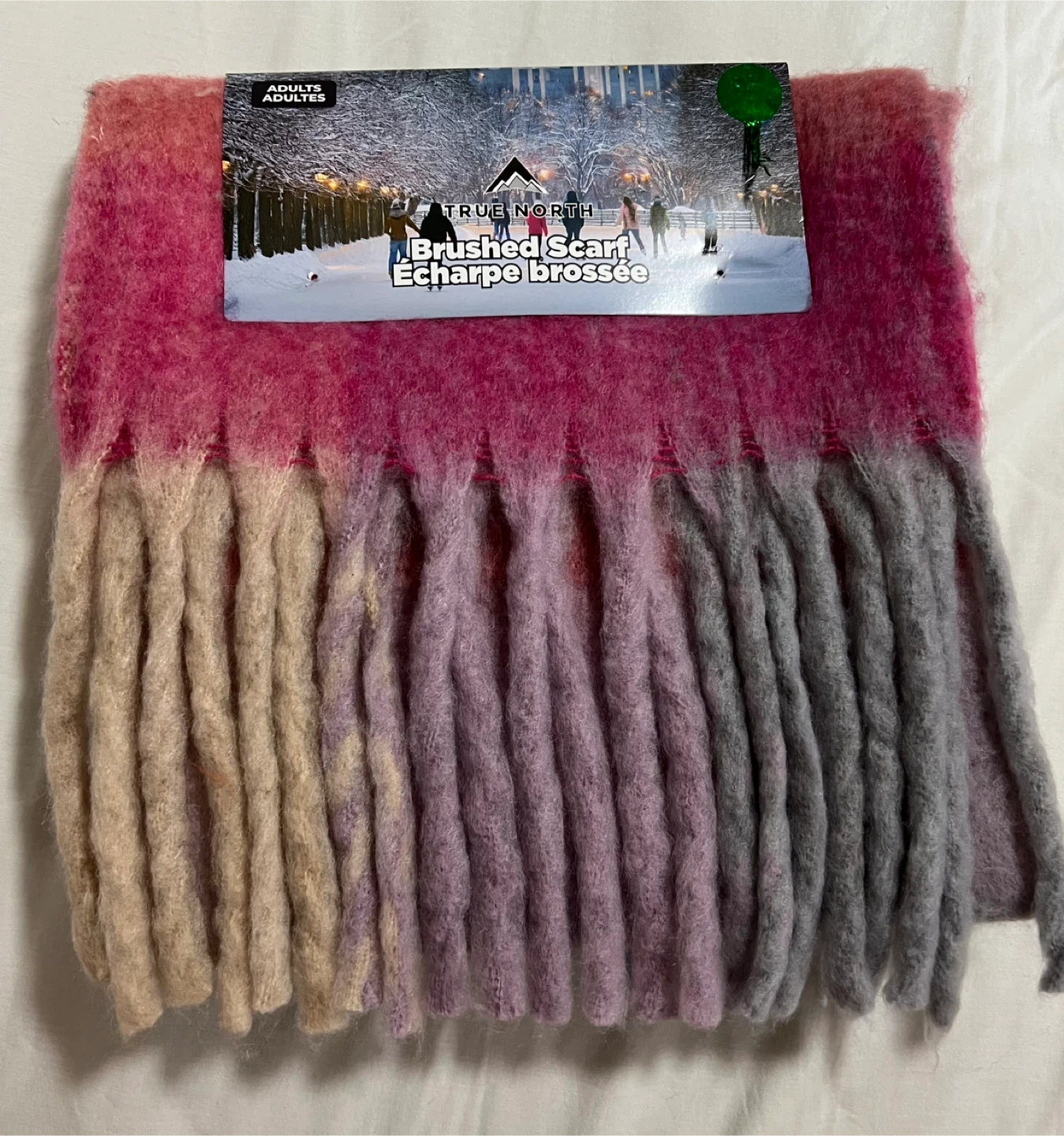Cozy up with this brand new True North brushed scarf! It's made of 100% acrylic, so it's super soft and warm. The colours are a beautiful blend of pink, beige, purple, and grey, perfect for adding a touch of style to any outfit. This scarf is new with tags and ready to keep you snug all winter long