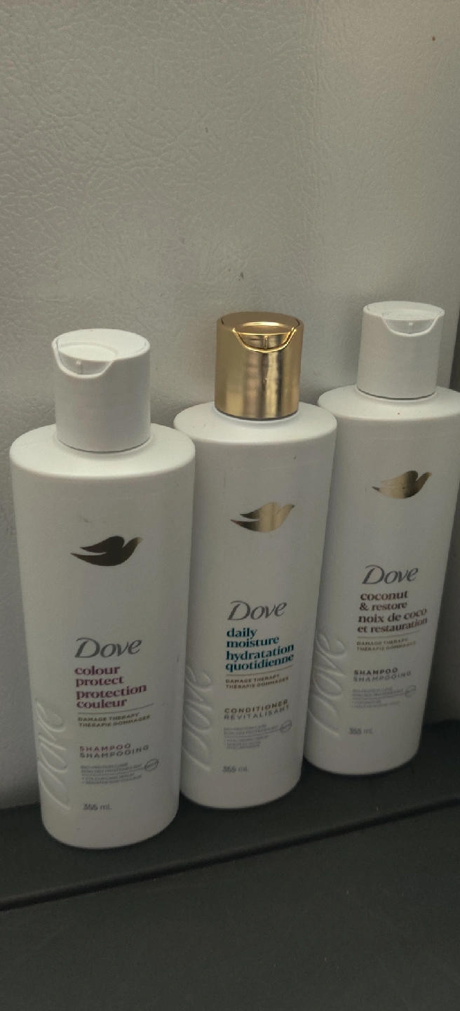 Selling a set of Dove shampoo and conditioner bottles. Each bottle is 355 mL. The set includes: - Dove Daily Moisture Conditioner - Dove Colour Protect Shampoo - Dove Coconut & Restore Shampoo Perfect for trying out different Dove hair care products!