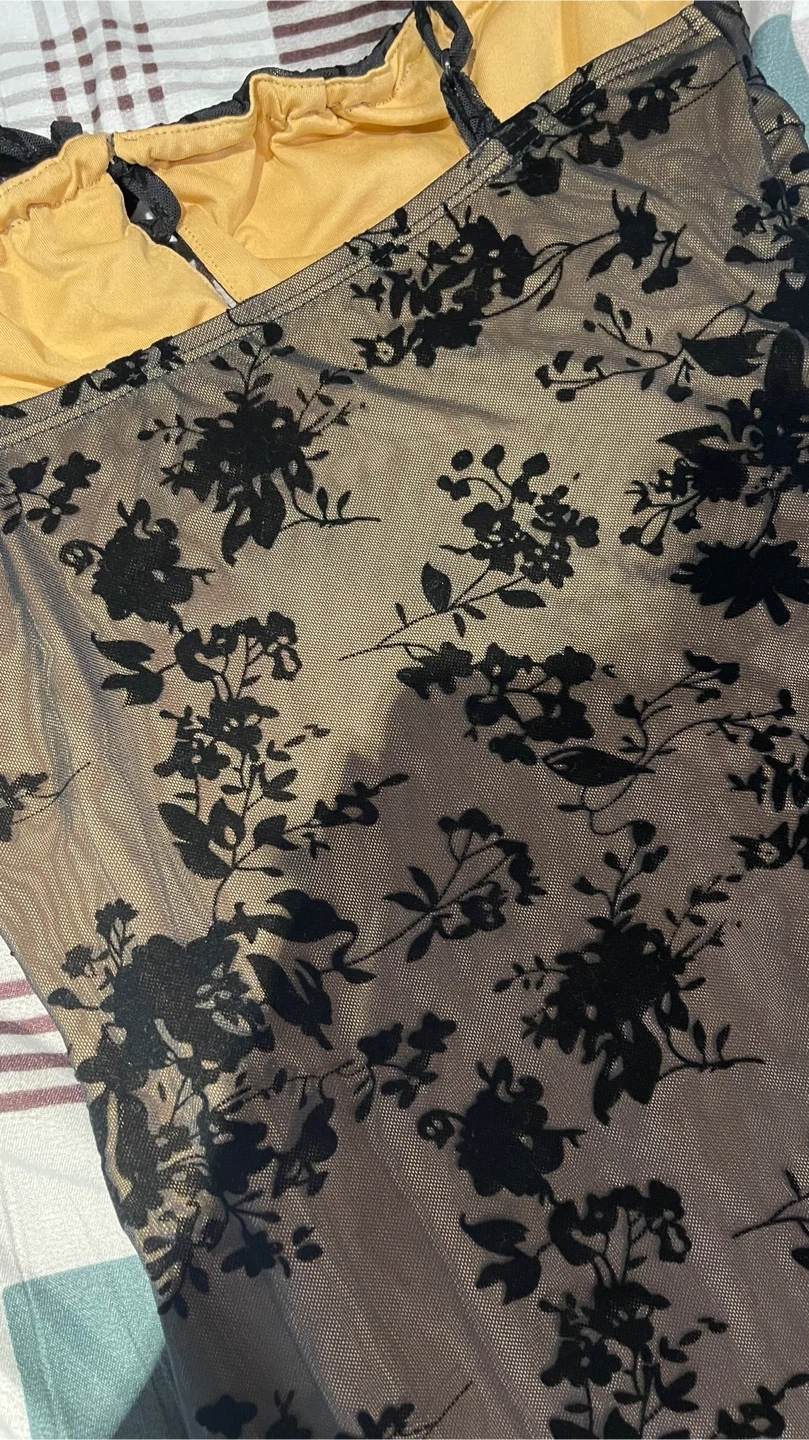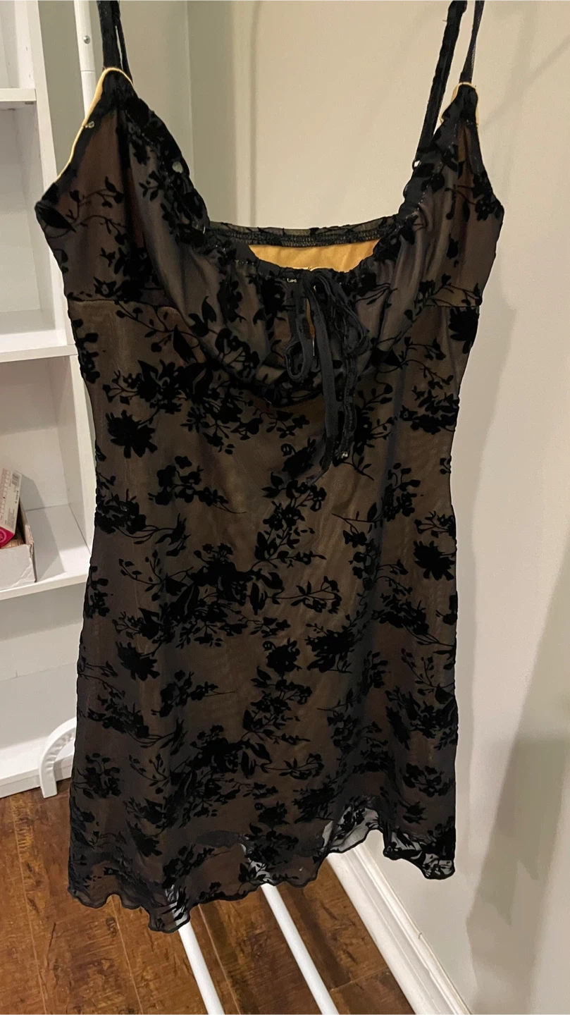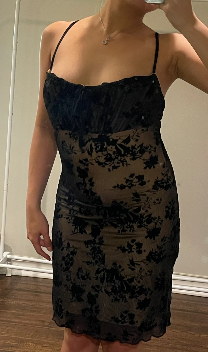 Never worn mini dress with black floral lace and skin-like inner dress.