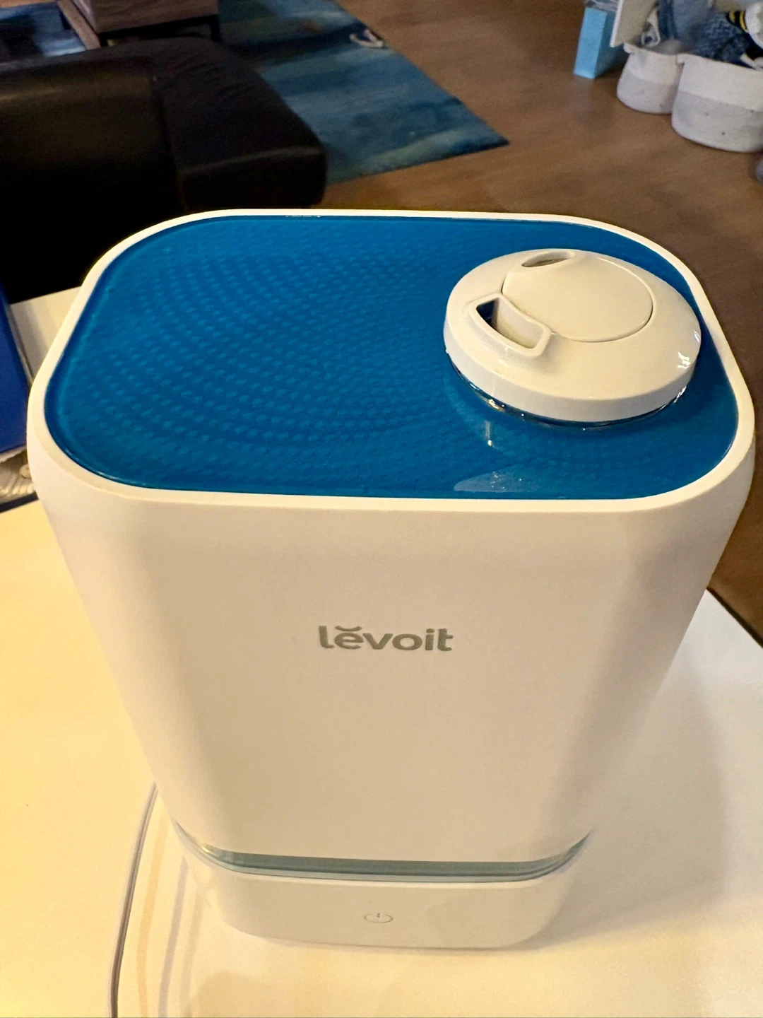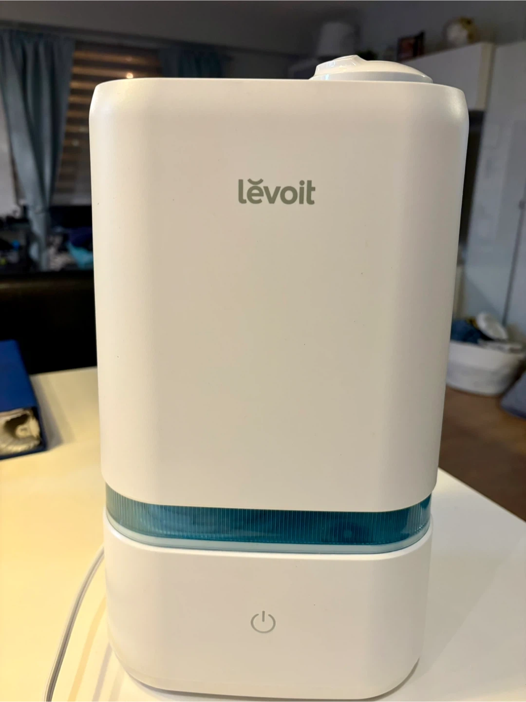 Selling a Levoit humidifier in great condition. It's white with a blue top and bottom accent. Perfect for keeping the air moist and comfortable!