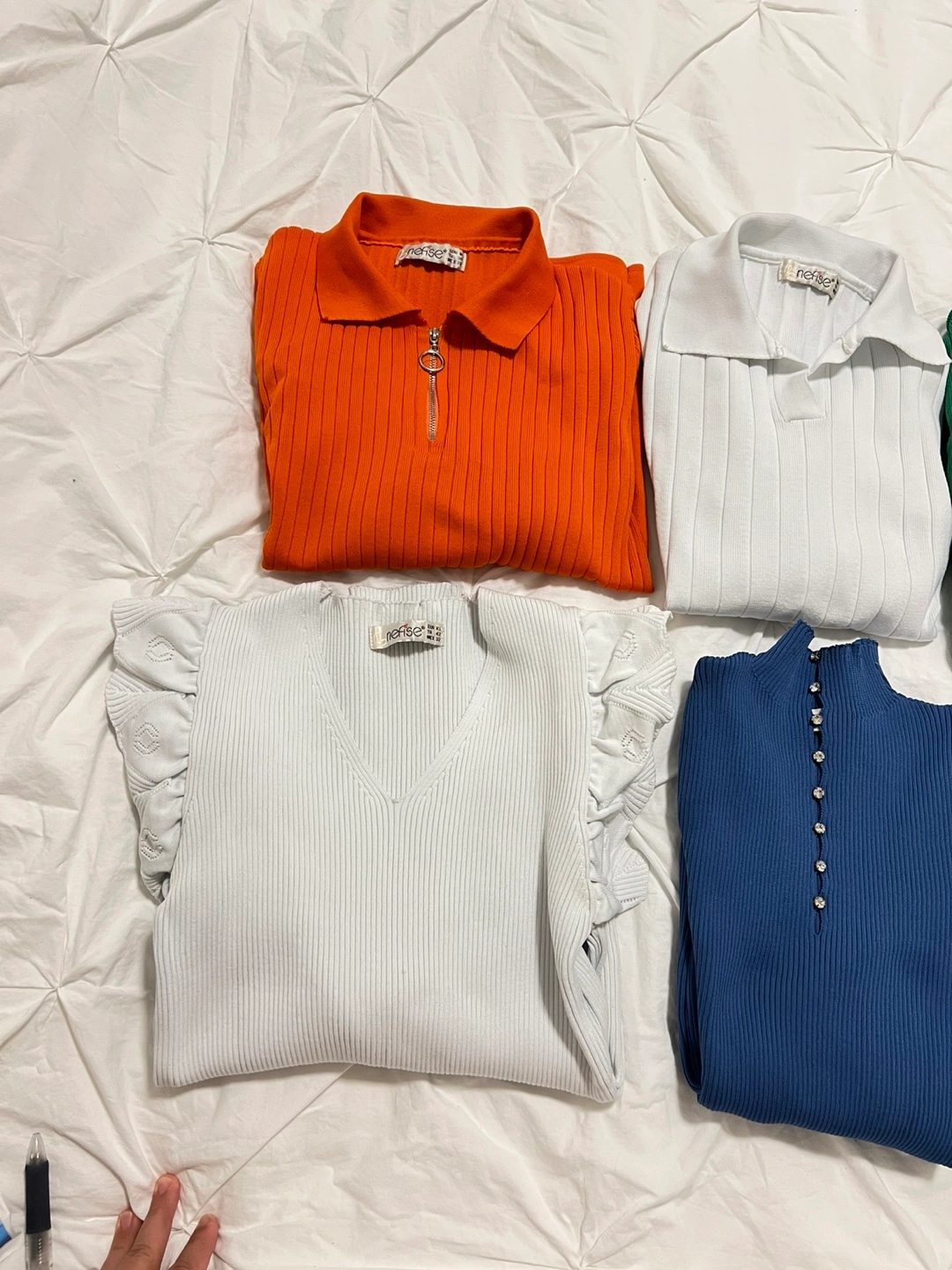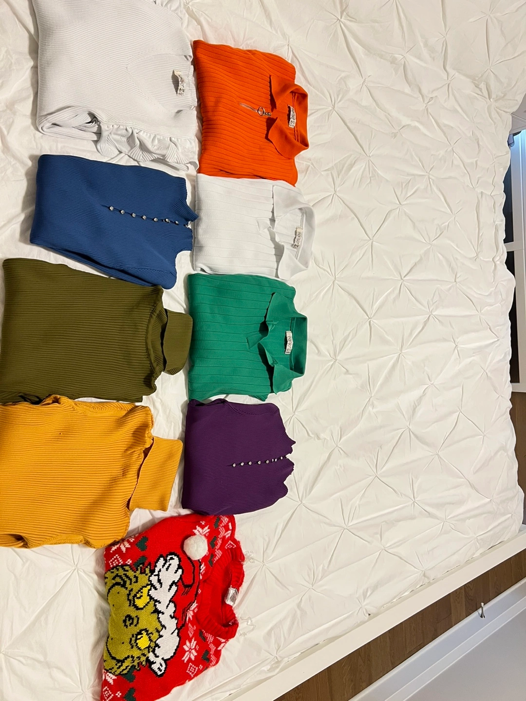 Selling a variety of knit tops. Great for layering or wearing on their own. The colors include white, orange, blue, green, purple, olive, and yellow. All are in good condition and ready for a new home