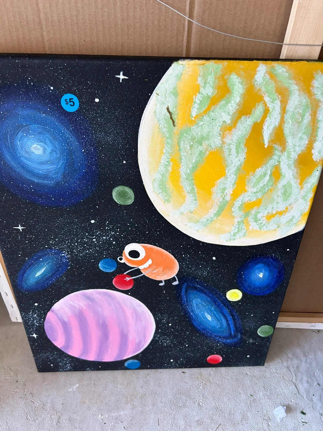 Selling this cute space-themed painting! It features planets, stars, and a little orange character. Asking $5