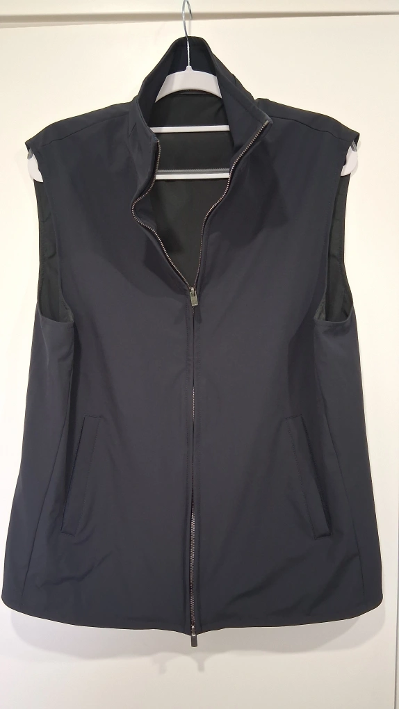 A navy blue sleeveless vest, perfect for layering! It features a full zipper and two front pockets. Great for adding a touch of style and warmth to any outfit