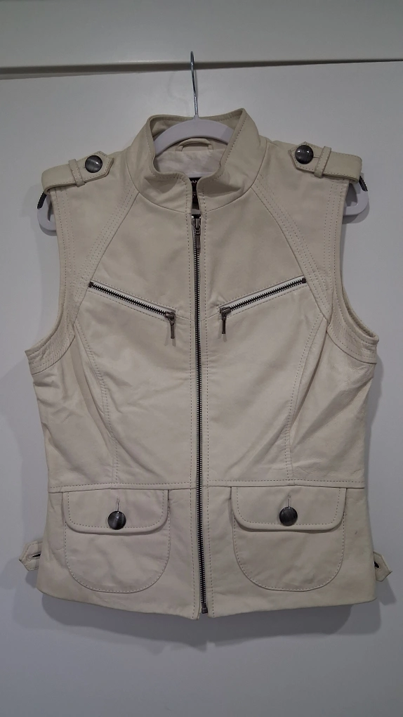 Selling a Danier leather vest in size small. It is a cream colour with a unique wing design on the inside lining. It has a few pockets and a zipper closure. Perfect for layering!