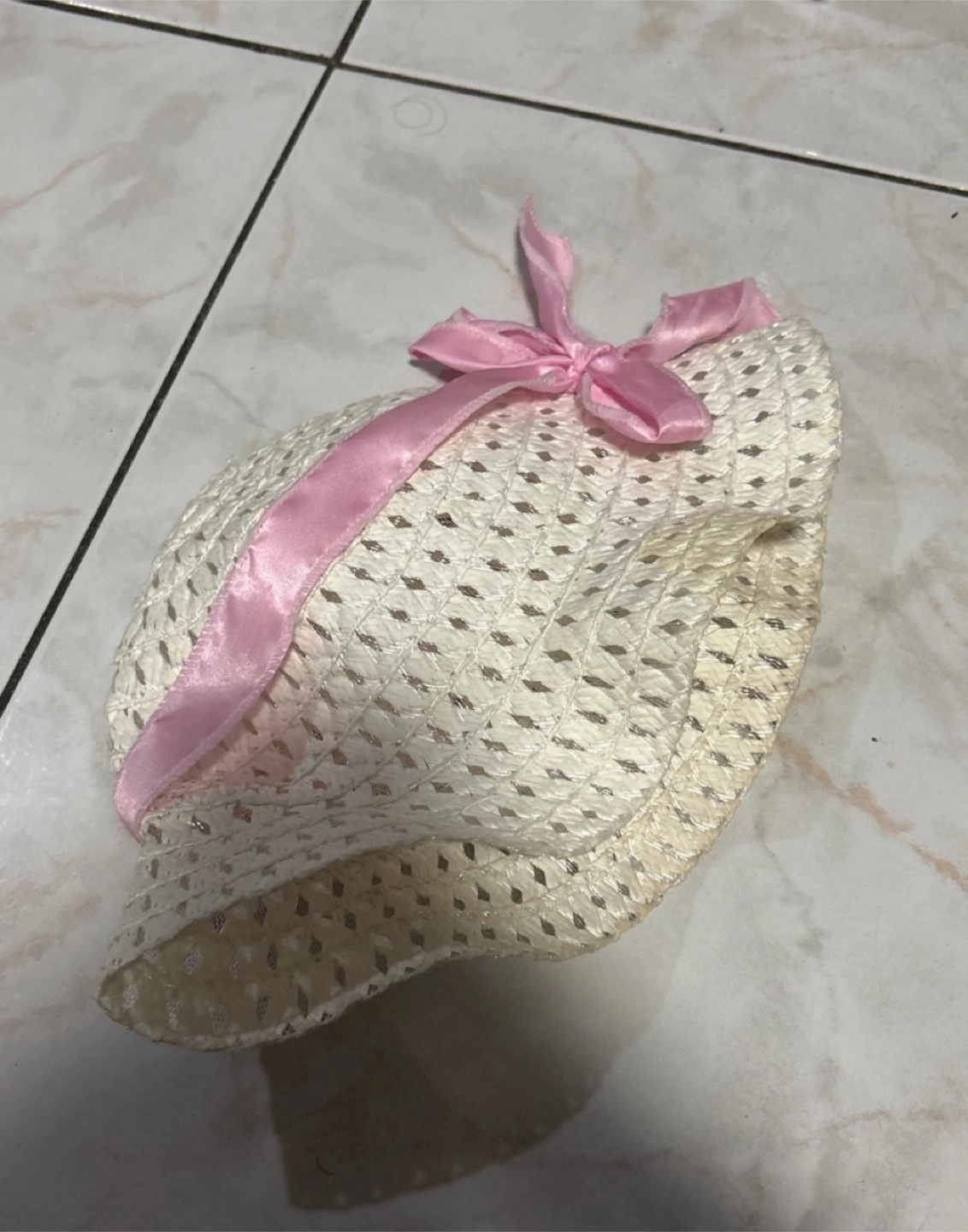 A cute cream-coloured baby hat with a sweet pink ribbon detail! Perfect for keeping your little one shaded and stylish during sunny days