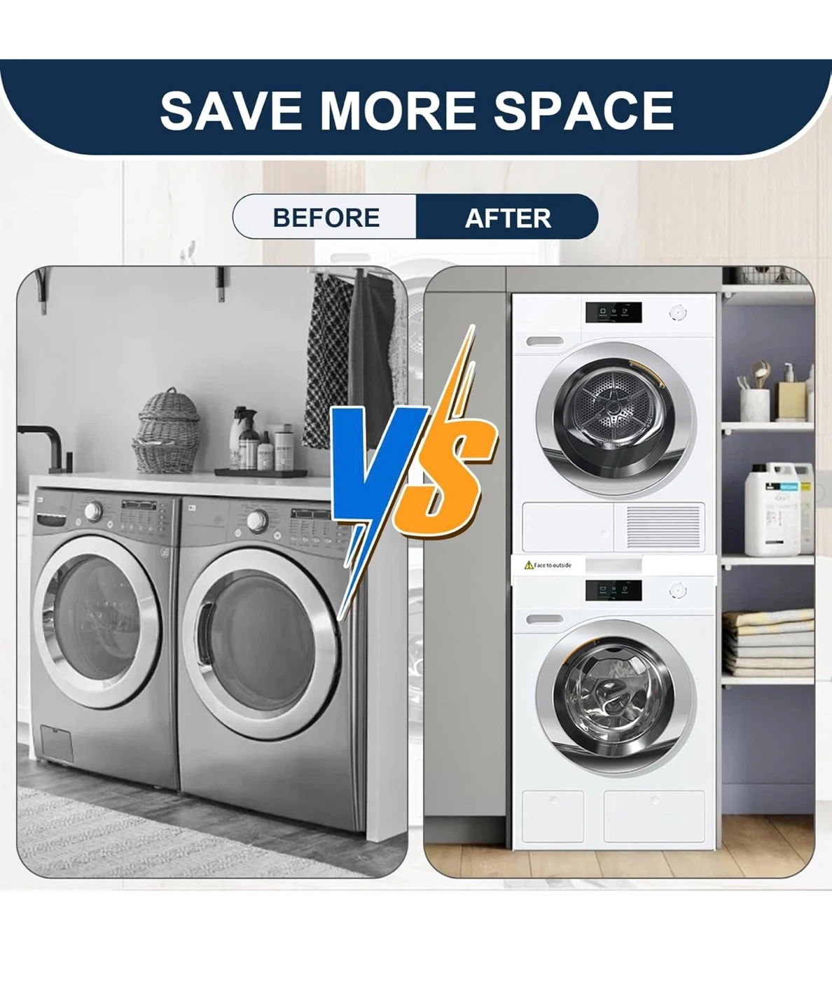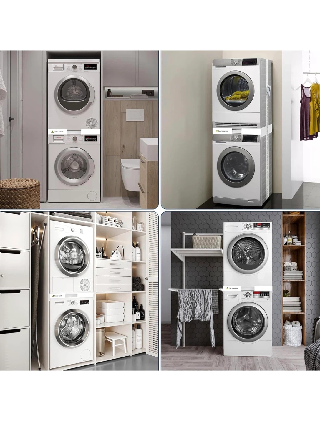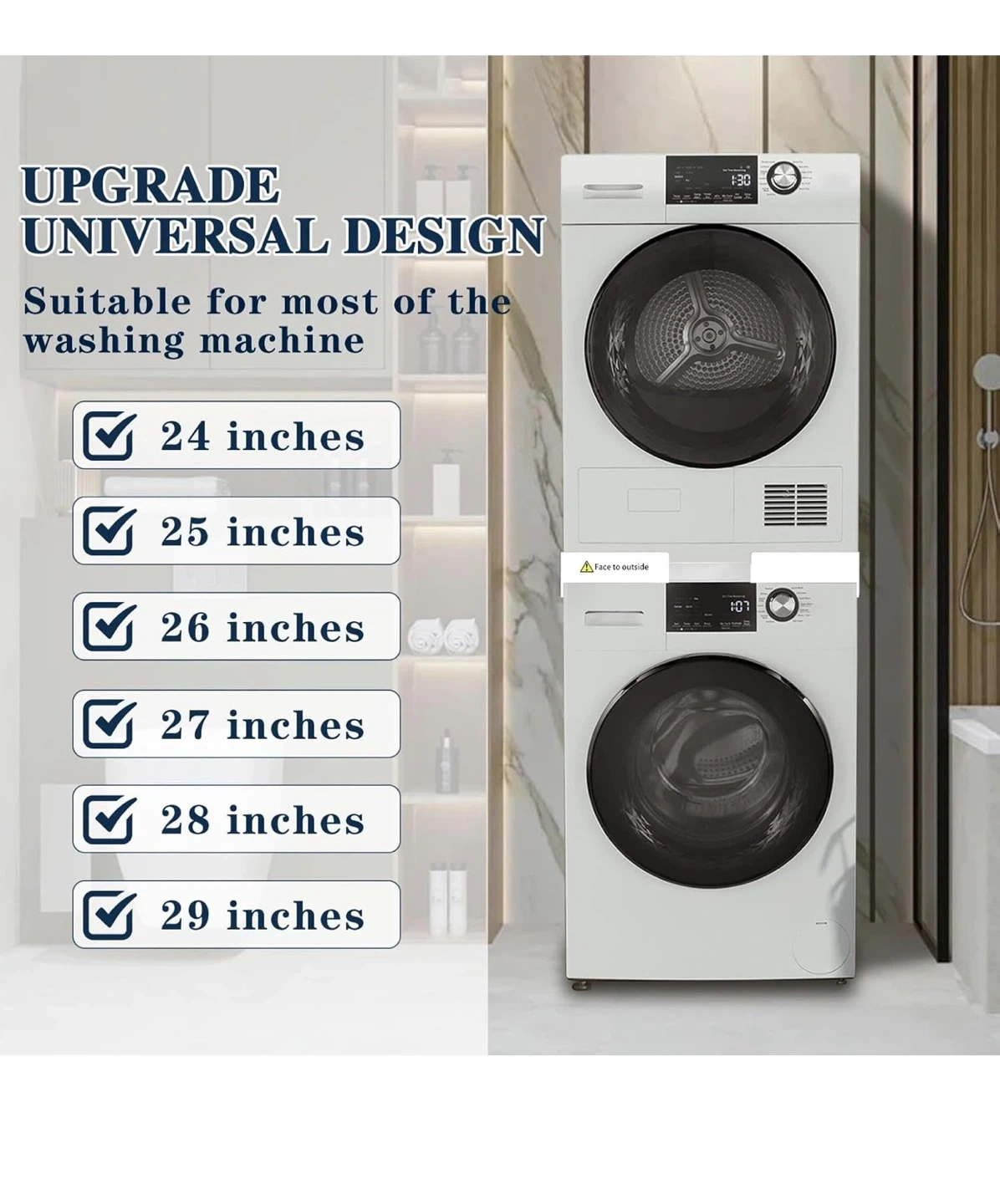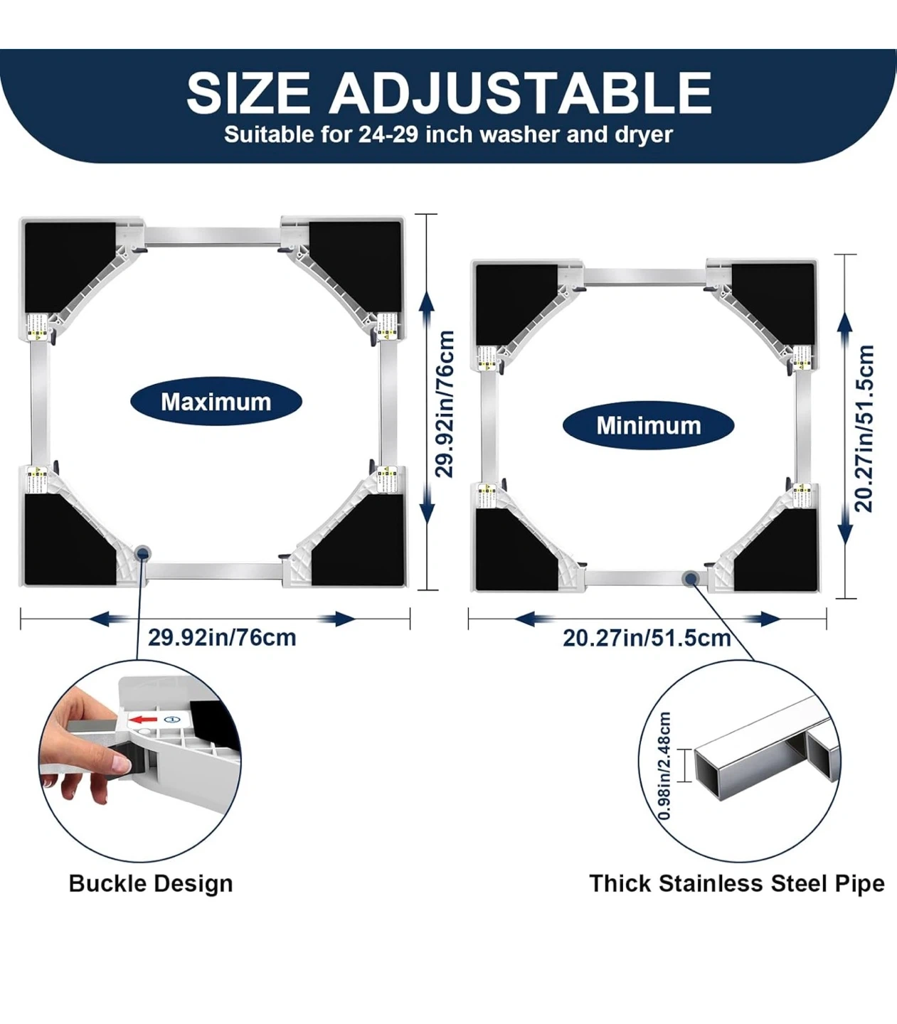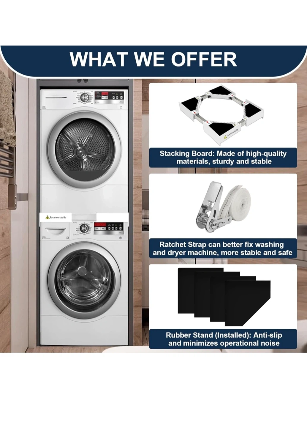 This HHXRISE washer and dryer stacking kit is suitable for 24-29 inch washers and dryers. It helps save more space by allowing you to stack your machines. The kit includes a stacking board made of high-quality materials, a ratchet strap for better fixing, and a rubber stand to minimize operational noise. It is size adjustable and features a buckle design with a thick stainless steel pipe