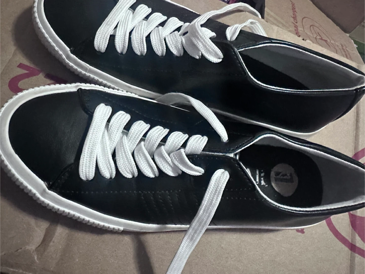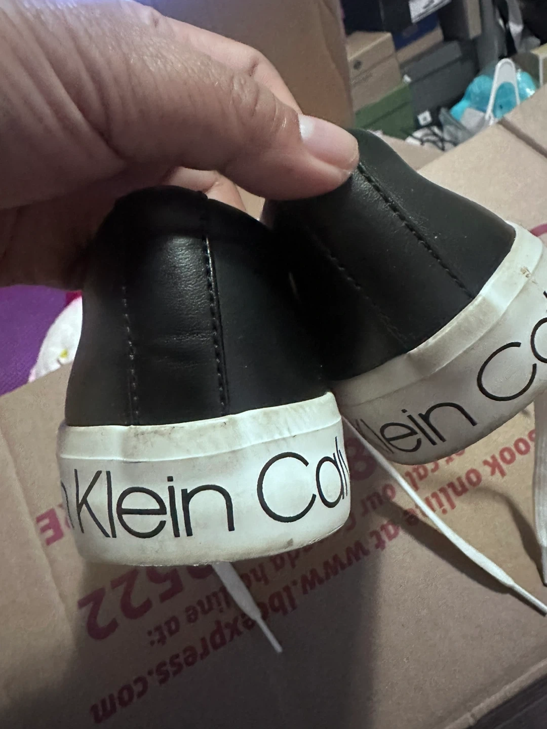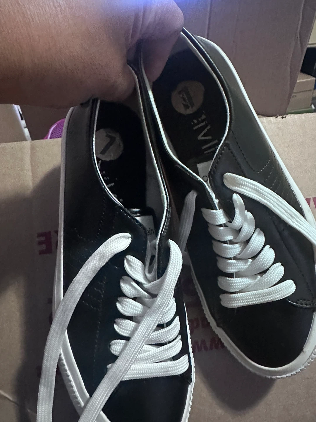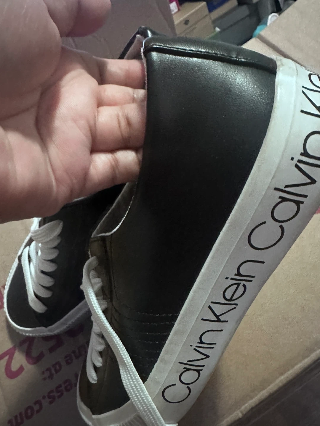 Selling a pair of Calvin Klein sneakers in black! They're a size 7 and have white laces. The soles have the Calvin Klein logo on them. They show some signs of wear but are still in good condition!