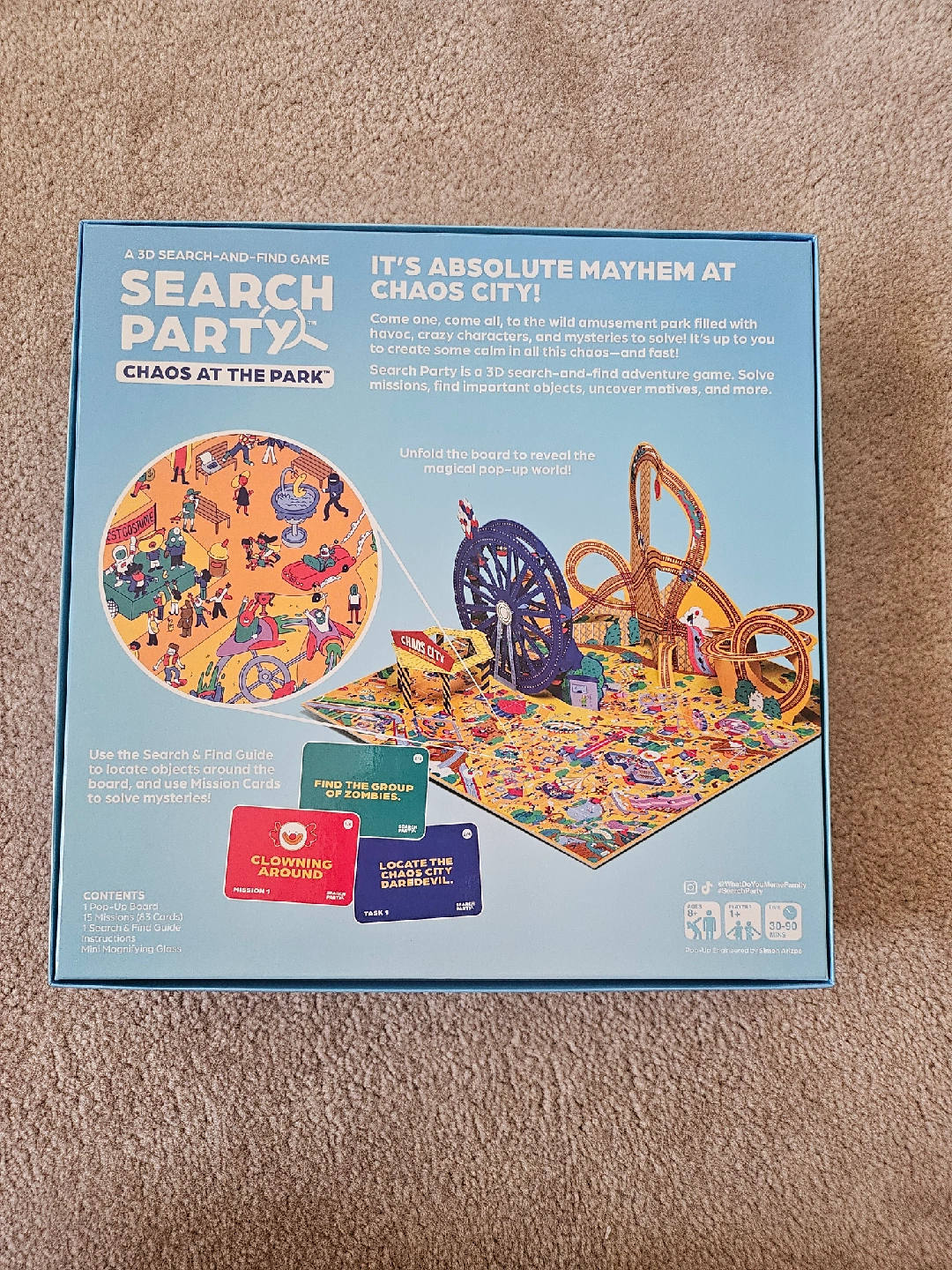 Get ready for some fun with the Search Party: Chaos at the Park 3D search-and-find game! It's absolute mayhem at Chaos City amusement park, filled with havoc, crazy characters, and mysteries to solve. Use the Search & Find Guide to locate objects, characters, and more on the 3D pop-up board, and the Mission Cards to solve mysteries. Unfold the board to reveal the magical pop-up world!