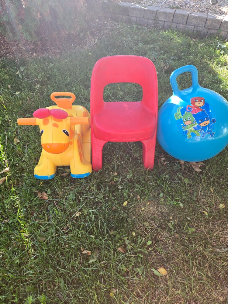 Selling a set of kids' items! This includes a ride-on giraffe toy, a red plastic step 2 chair, and a blue PJ Masks bouncy ball. All for $20