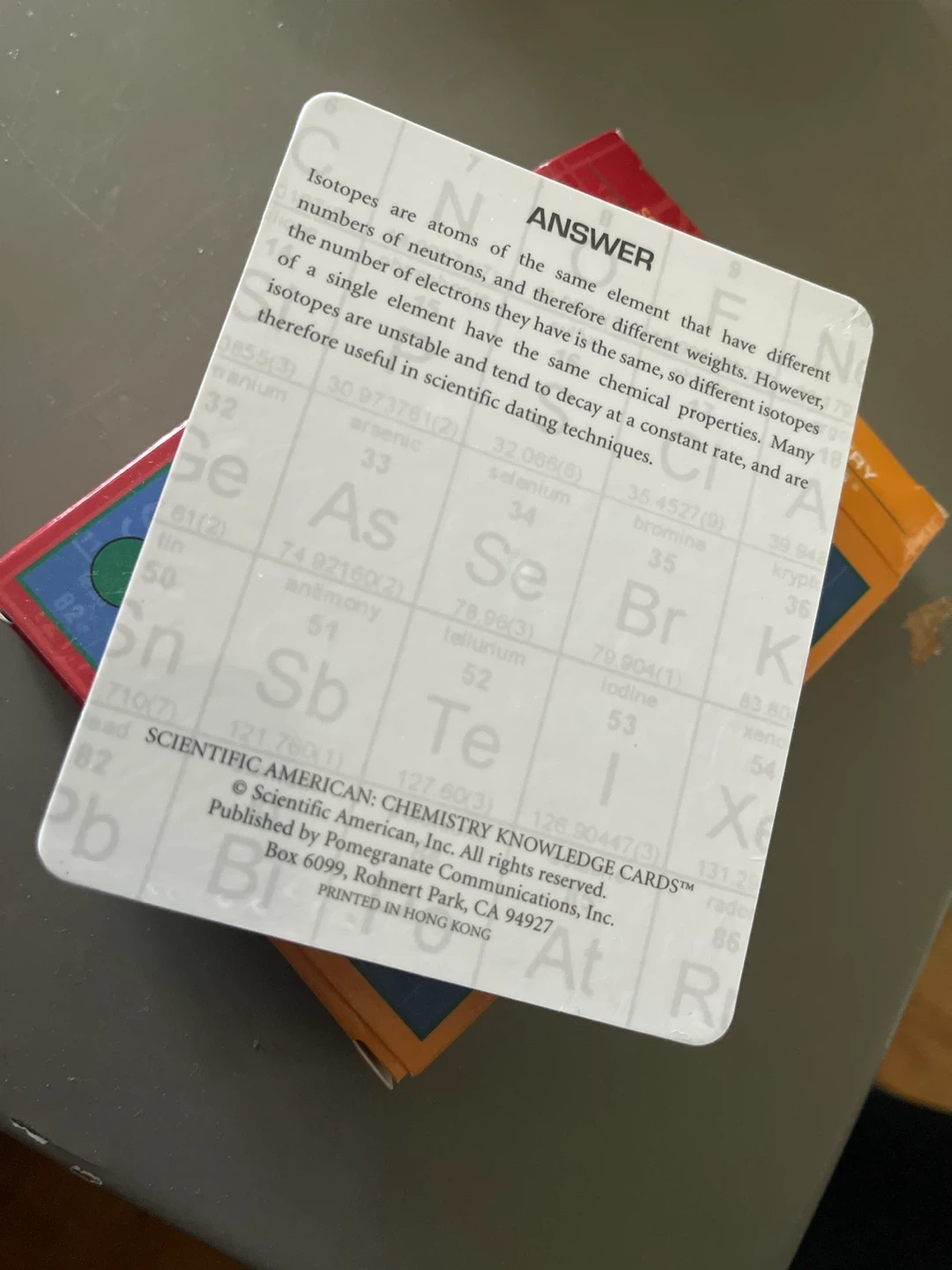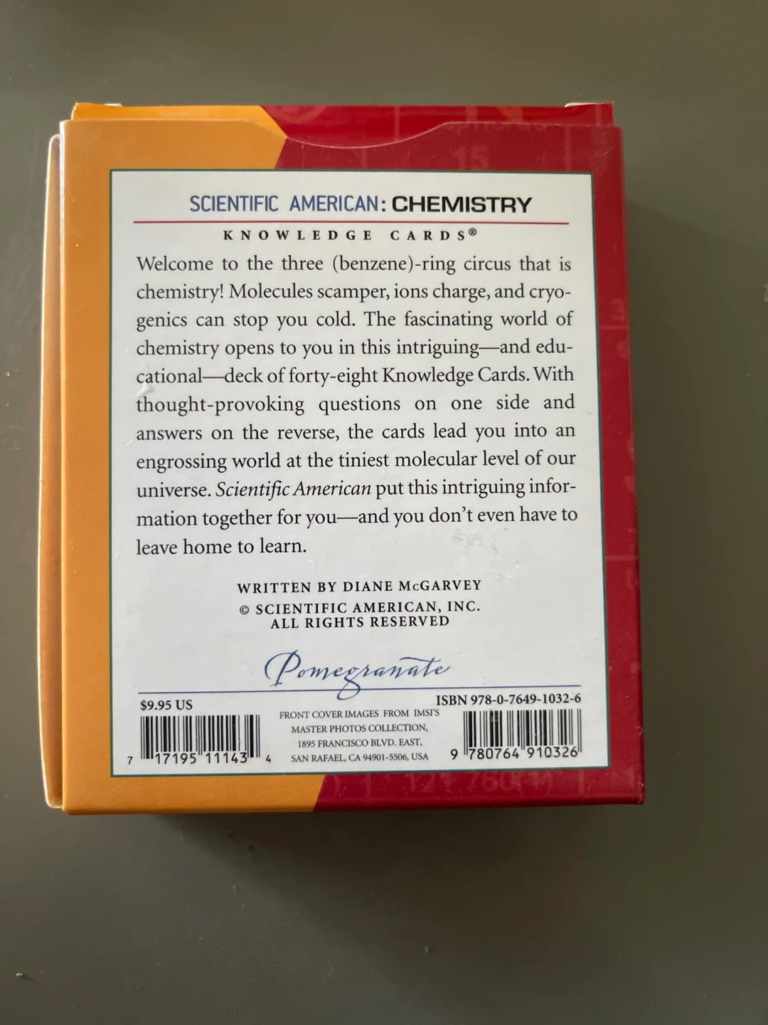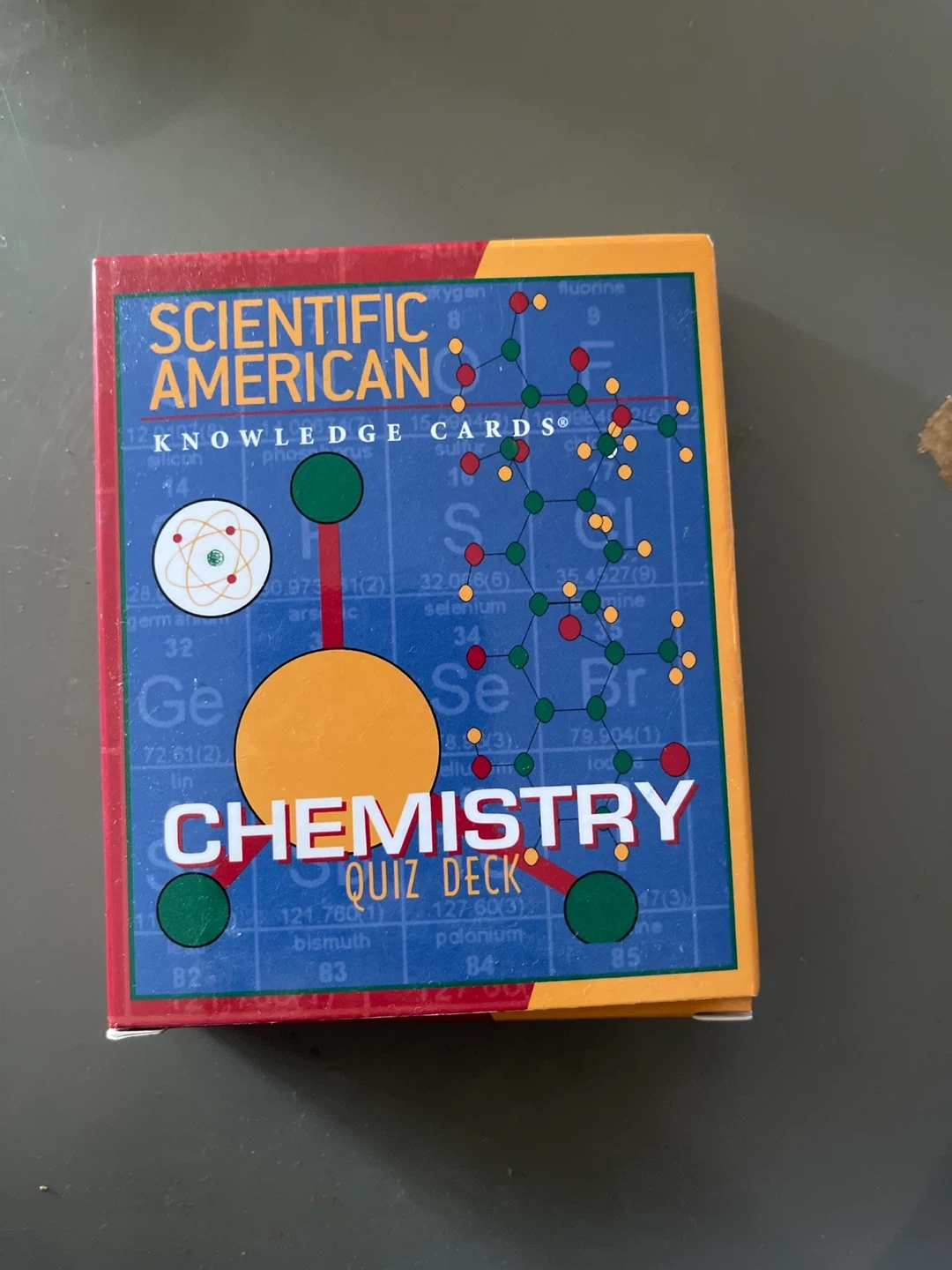 a Scientific American Chemistry Knowledge Cards Quiz Deck. It's a deck of forty-eight knowledge cards with thought-provoking questions on one side and answers on the reverse, leading you into an engrossing world at the tiniest molecular level of our universe