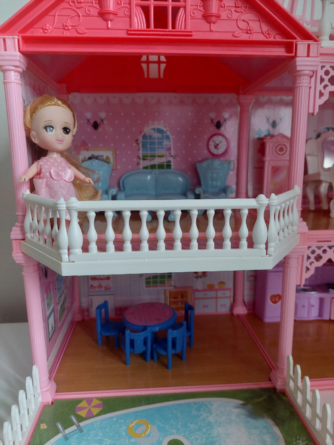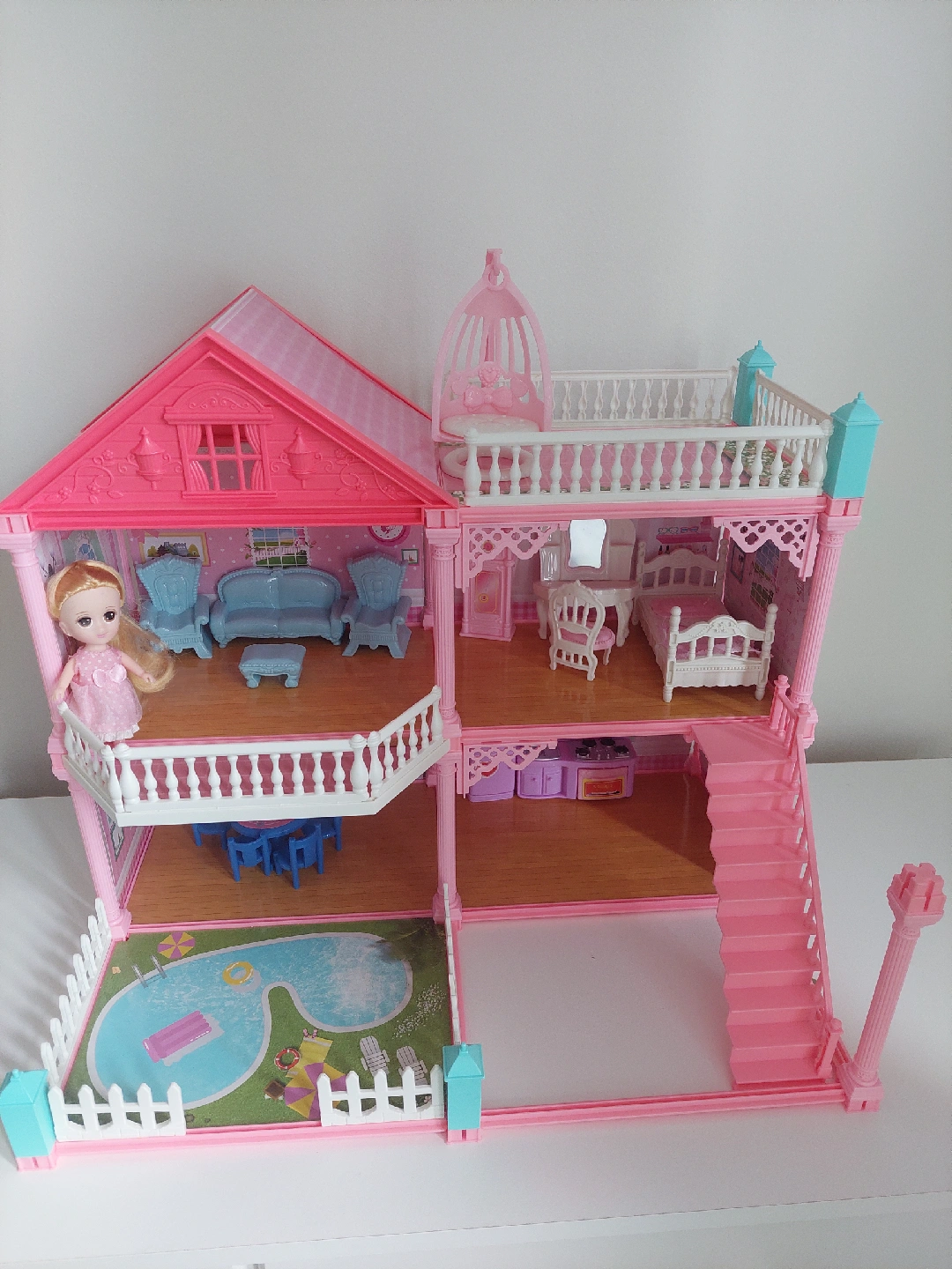 A cute dollhouse complete with furniture and a doll, cardboard walls and floor. It's in great shape and ready for a new home. Perfect for imaginative play!