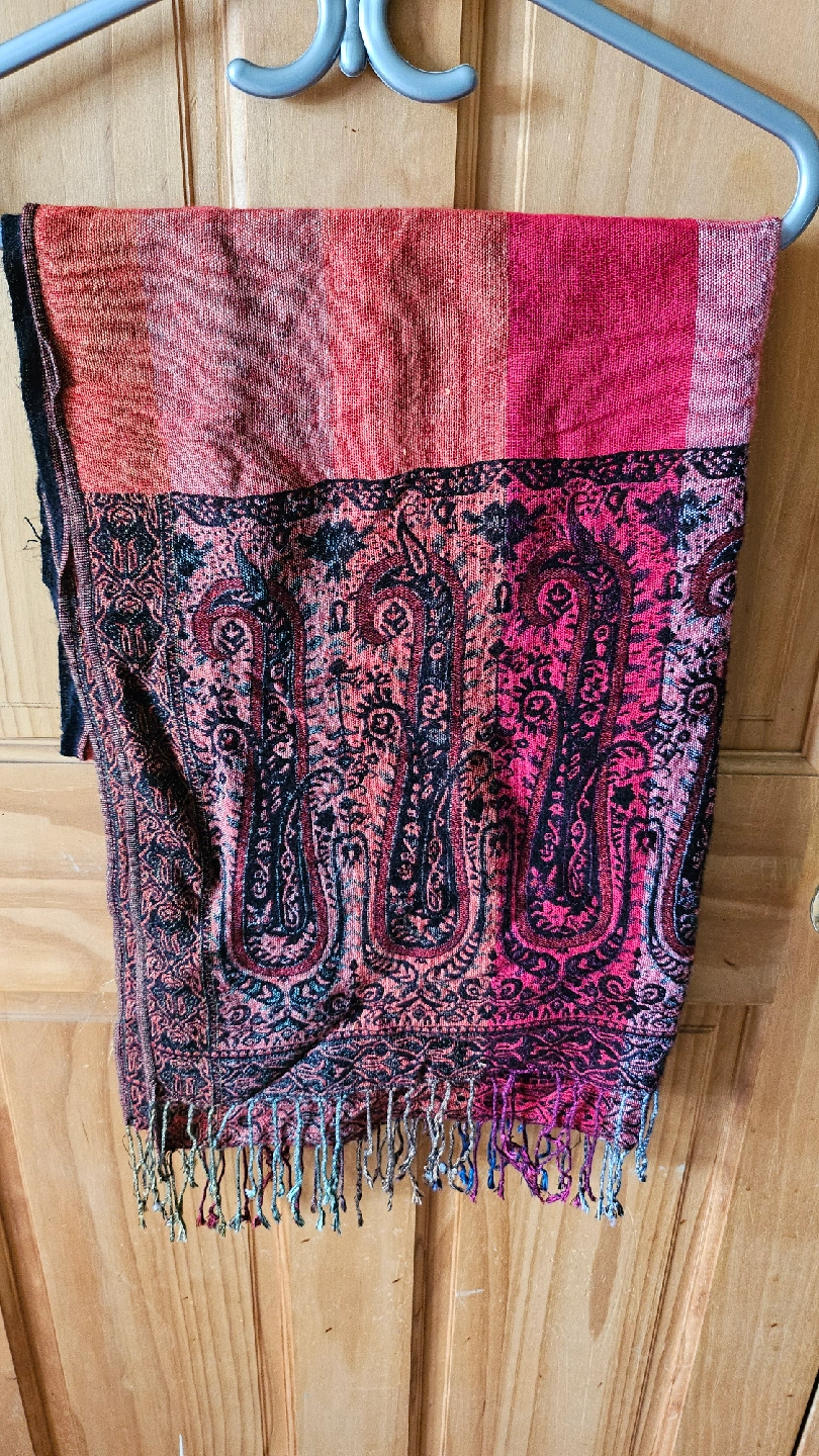 Selling a lovely pink patterned scarf! It has a beautiful design and would be a great addition to any outfit. The dtailing on the bottom is in black. The scarf is in great condition and ready for a new home. Available for pick-up near Oakwood Village.
