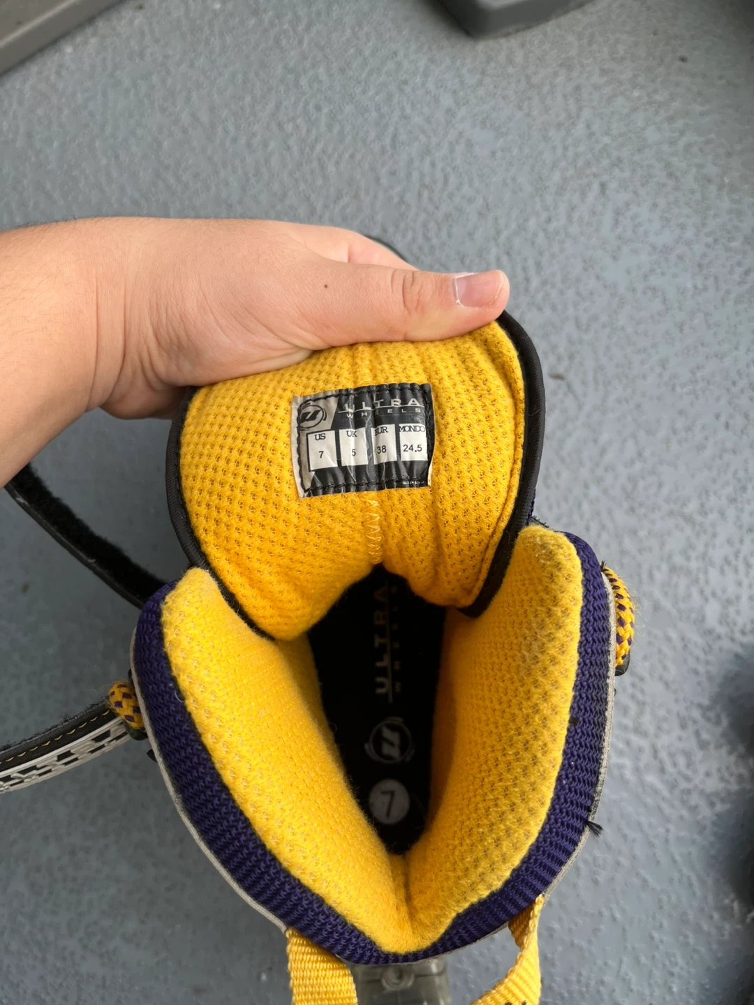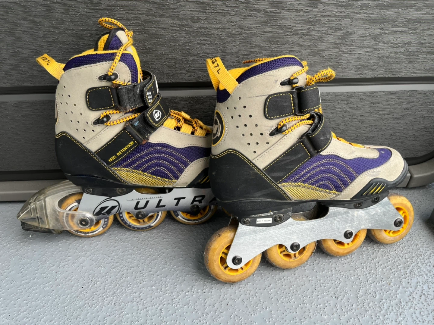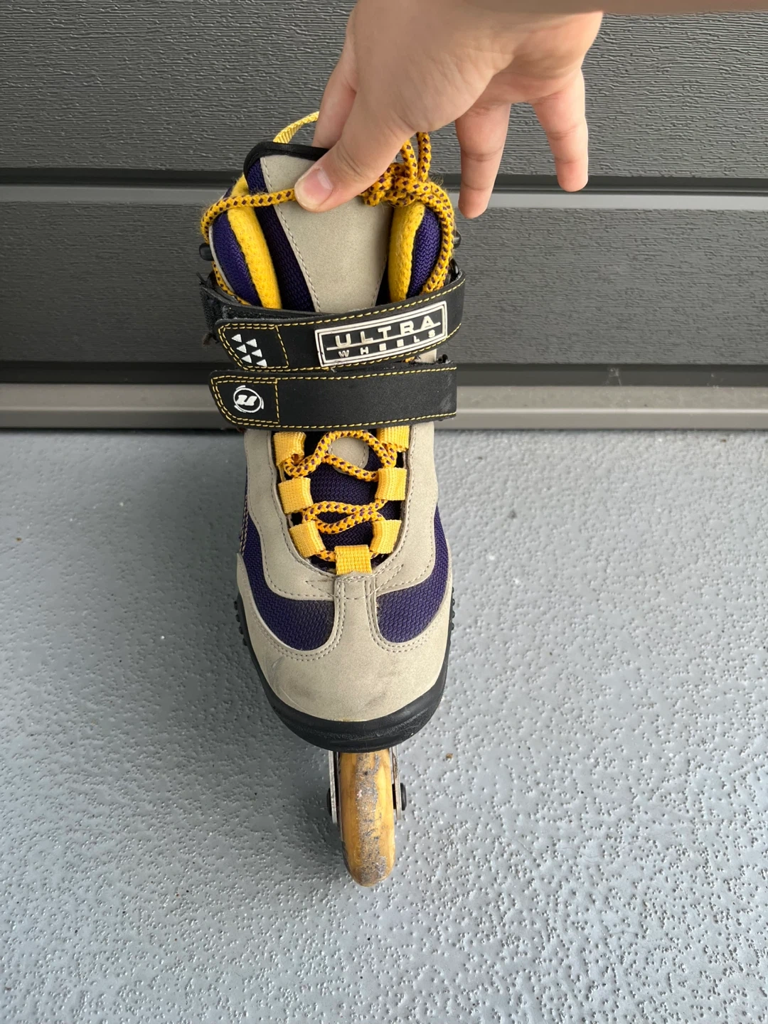 Selling a pair of Ultra Wheels roller blades in size 7. They are in good condition and ready for some fun! The colours are a mix of beige, yellow and purple. Perfect for a beginner or someone looking to upgrade their current skates