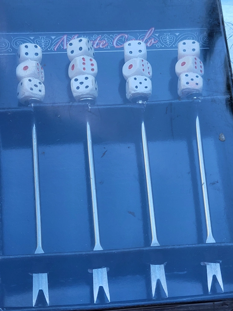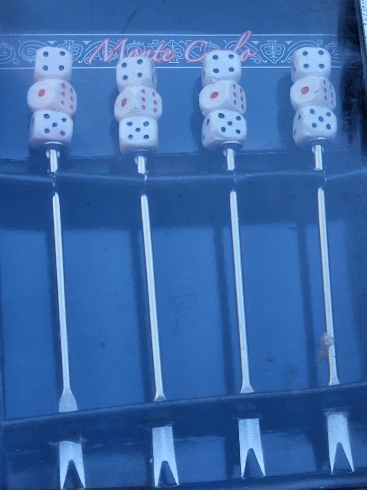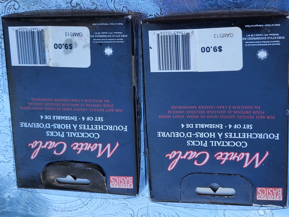 Selling 2 sets of 4 Monte Carlo cocktail picks. These hors-d'oeuvre forks are brand new in their original packaging. The box says to gently wash in warm, soapy water for best results. Each set was originally $9! $5 per set 2/$10