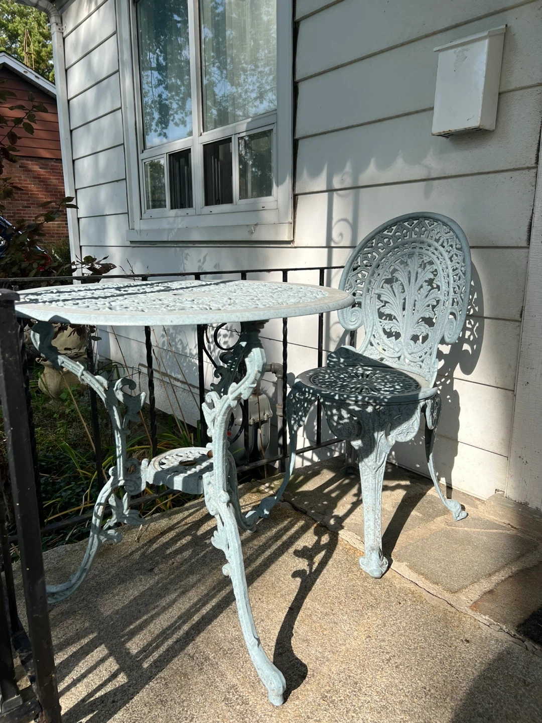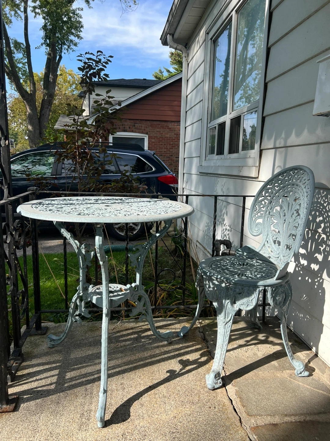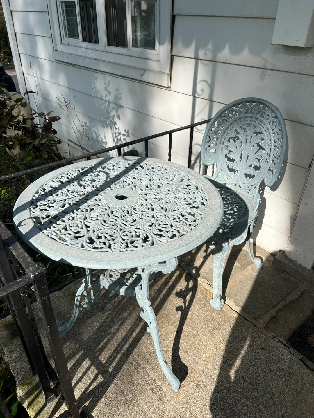 A charming metal patio set featuring a round table and a matching chair! The set has an ornate, vintage-inspired design with a light blue finish. Perfect for adding a touch of elegance to your porch or garden