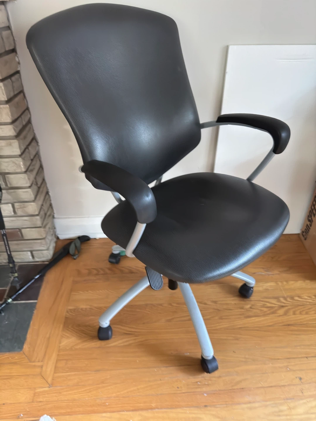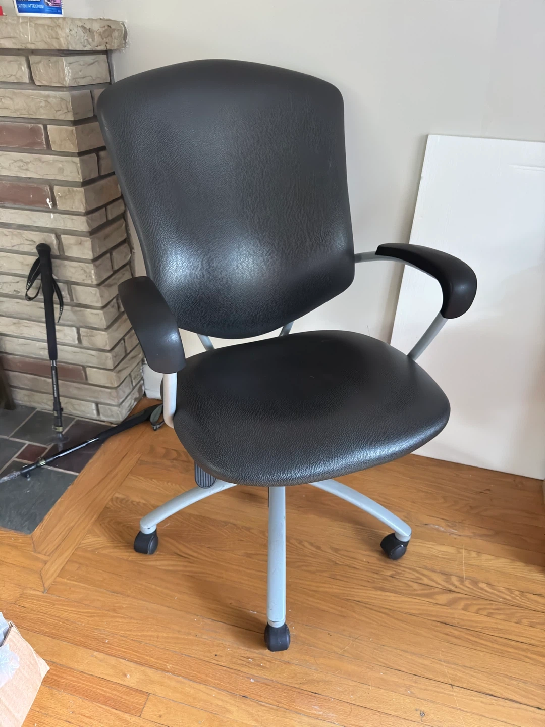 Selling a black office chair in great condition. It's perfect for your home office or study space. The chair features a comfortable seat and back, with armrests for added support. It also has a rolling base for easy movement around your workspace