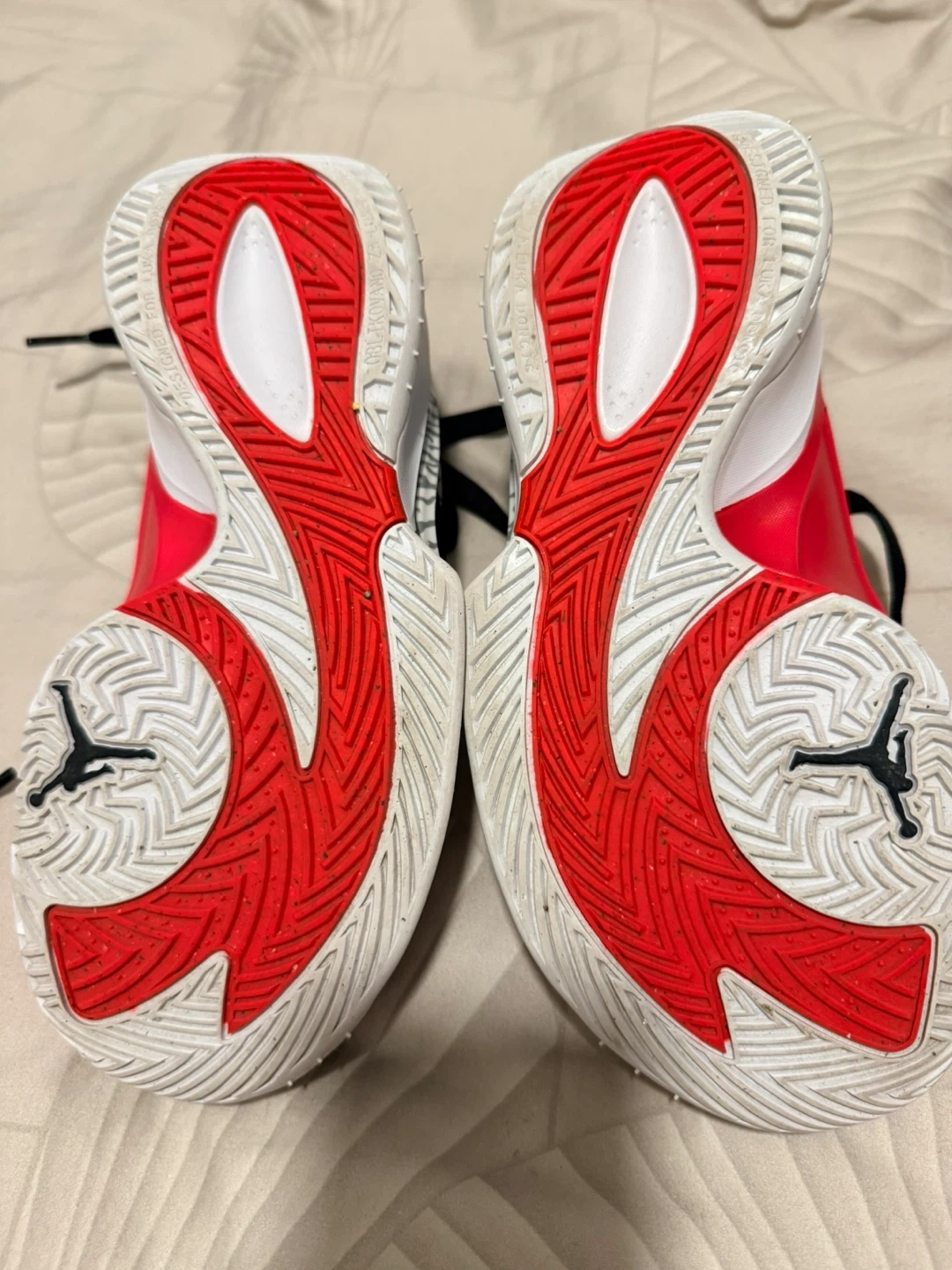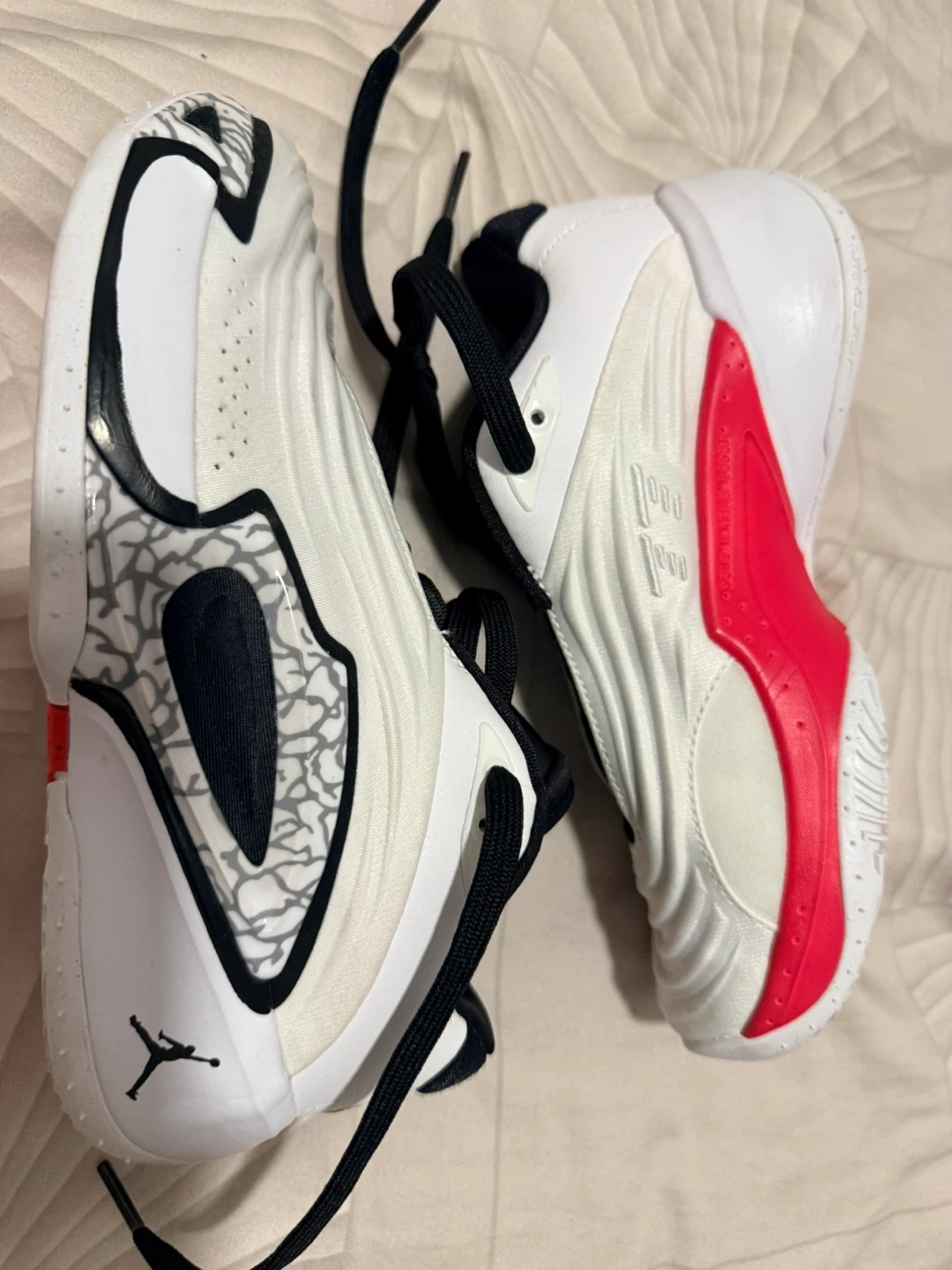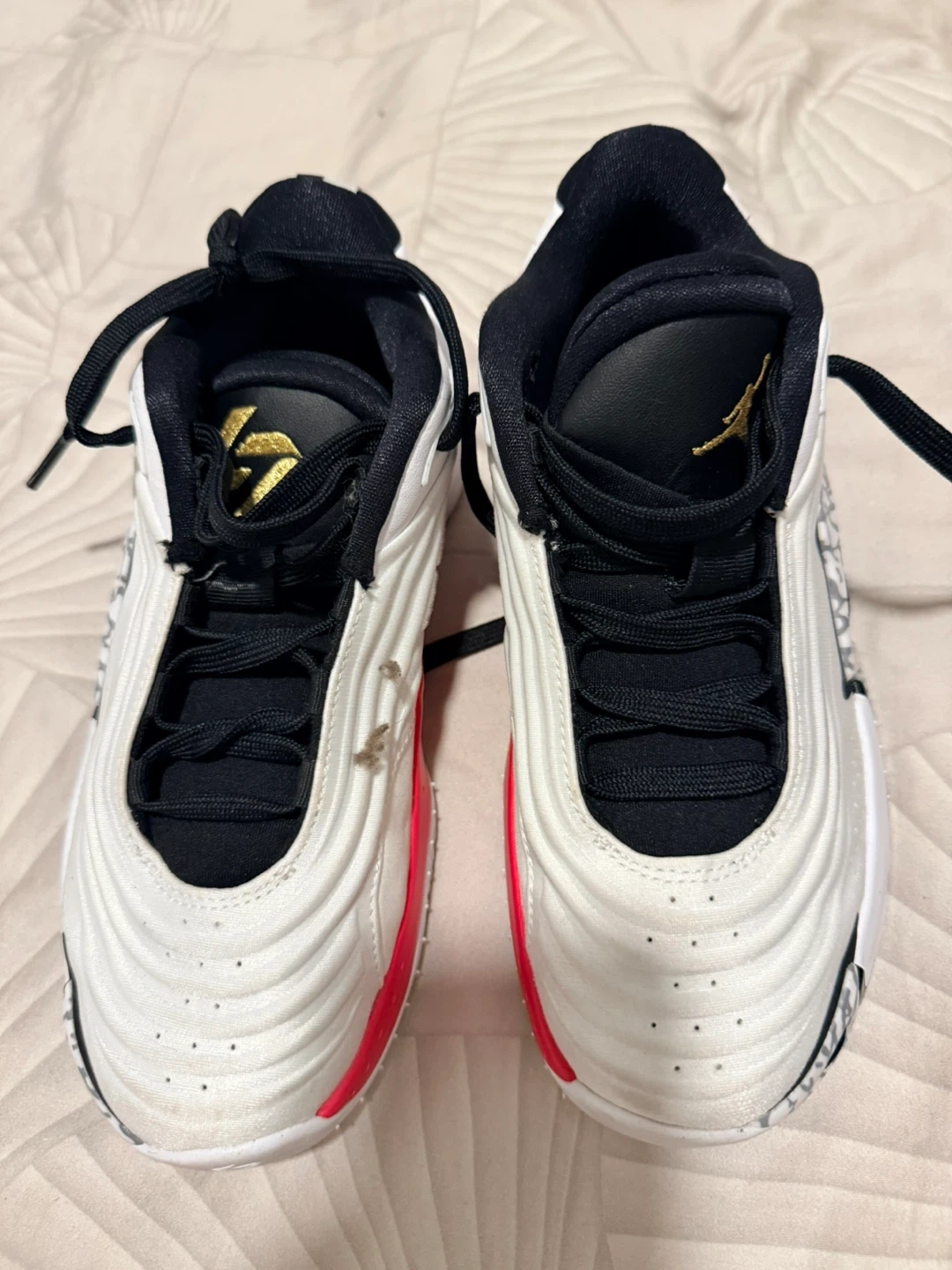 Selling a pair of Jordan basketball shoes. These shoes feature a white, black, and red colour scheme. They are in good condition and ready for the court!