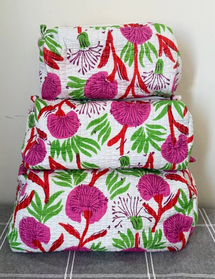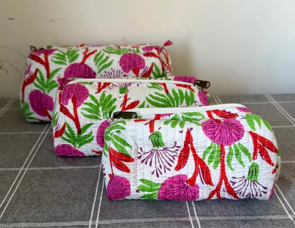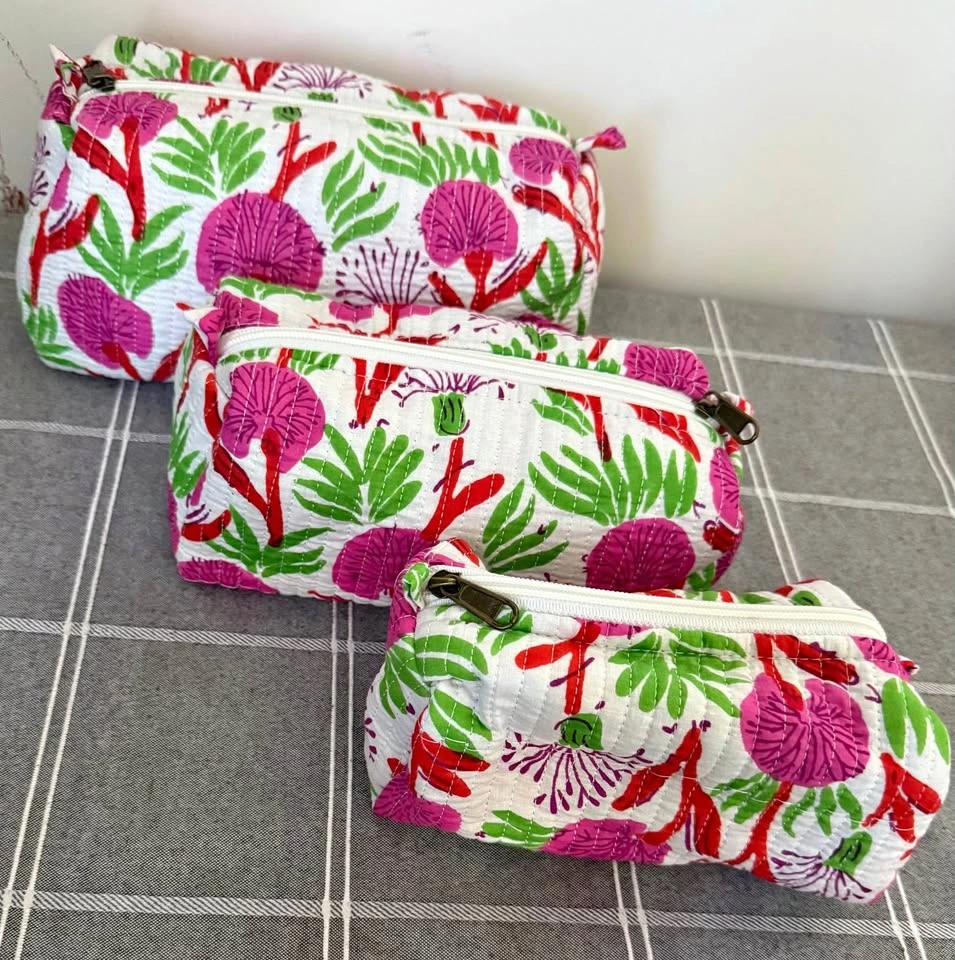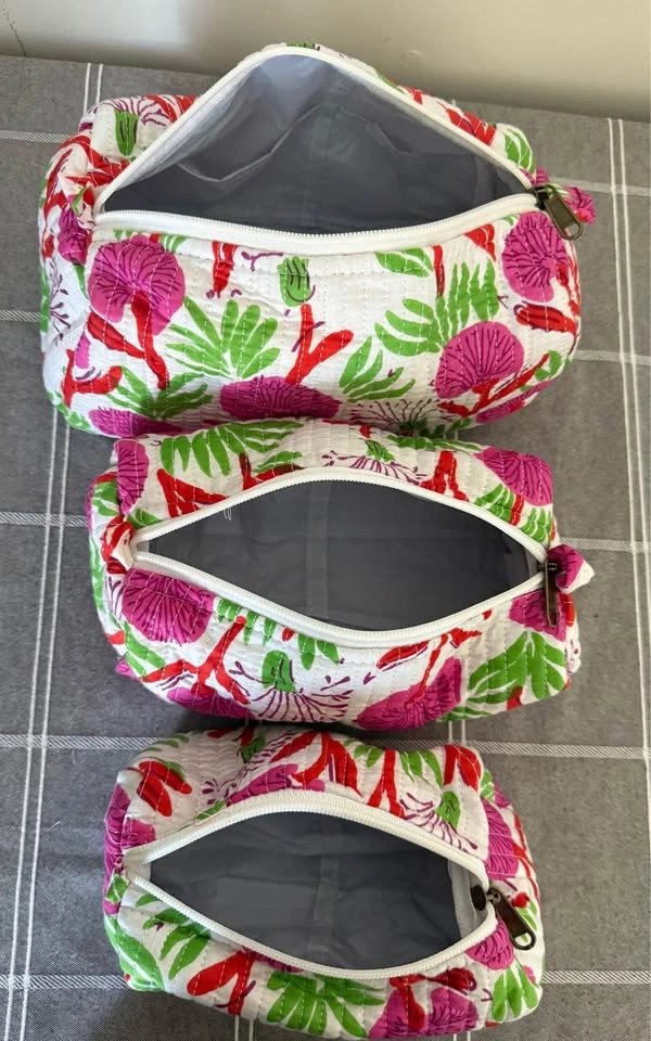 A three piece washable multipurpose eco friendly pouch set. Each pouch has waterproof lining inside. Dimensions of Big Pouch : l x w x h = 10” x 4.5” x 4.5” Dimensions of Medium size Pouch : l x w x h = 8.5” x 3.5” x 3.5” Dimensions of small pouch : l x w x h = 6.5” x 3” x 3”