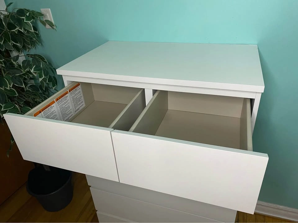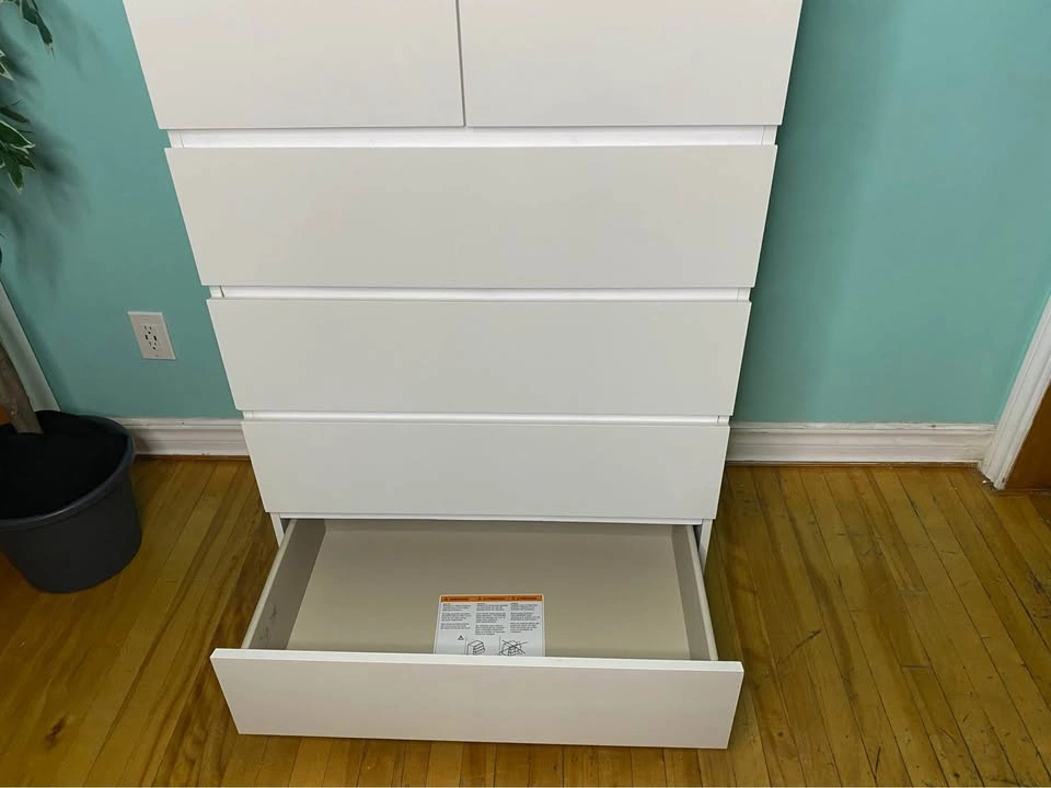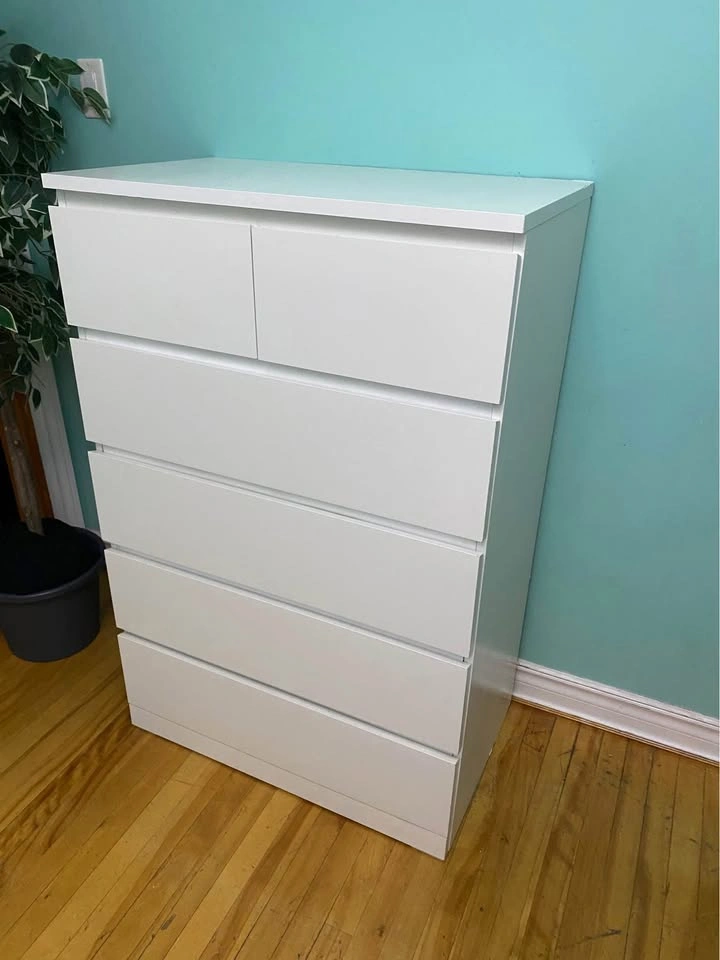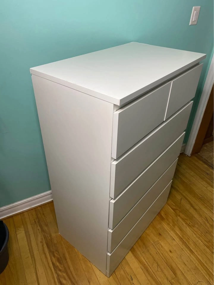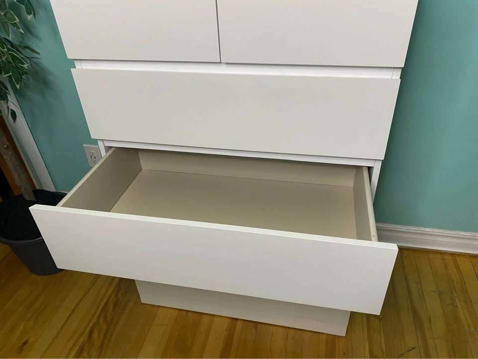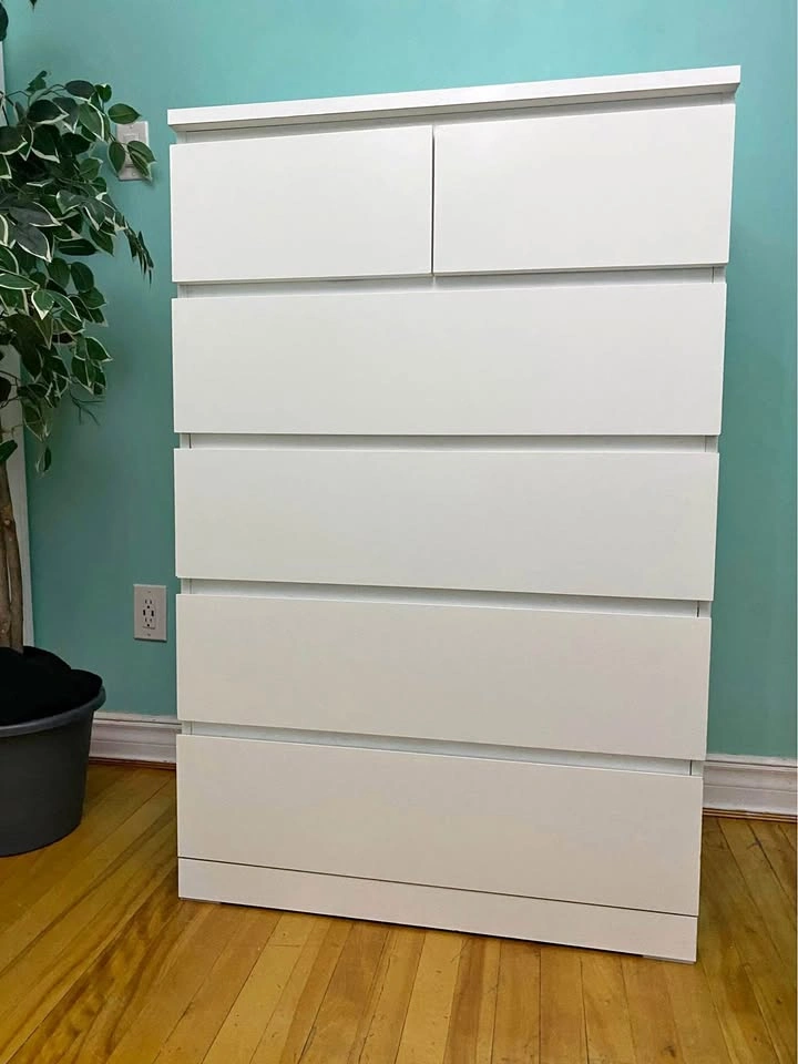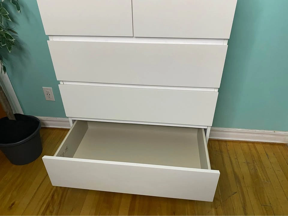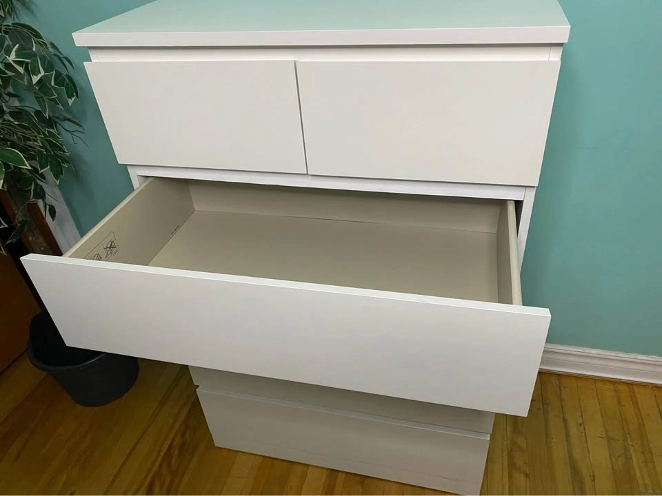 Tall modern white dresser in modern styling. All the drawers work like new (perfectly) and have super smooth movement. Drawers stop when fully retracted. Smoke-free / pet-free household, no discernible odours. Normally retails without assembly without delivery near 260 with taxes included. $220 Exact Measurements: Height: 48.5 inches (or 4 FT & 0.5 inches). Width: 31.65 inches (or 2 FT & 7.65 inches). Depth: 19 inches (or 1 FT & 7 inches).