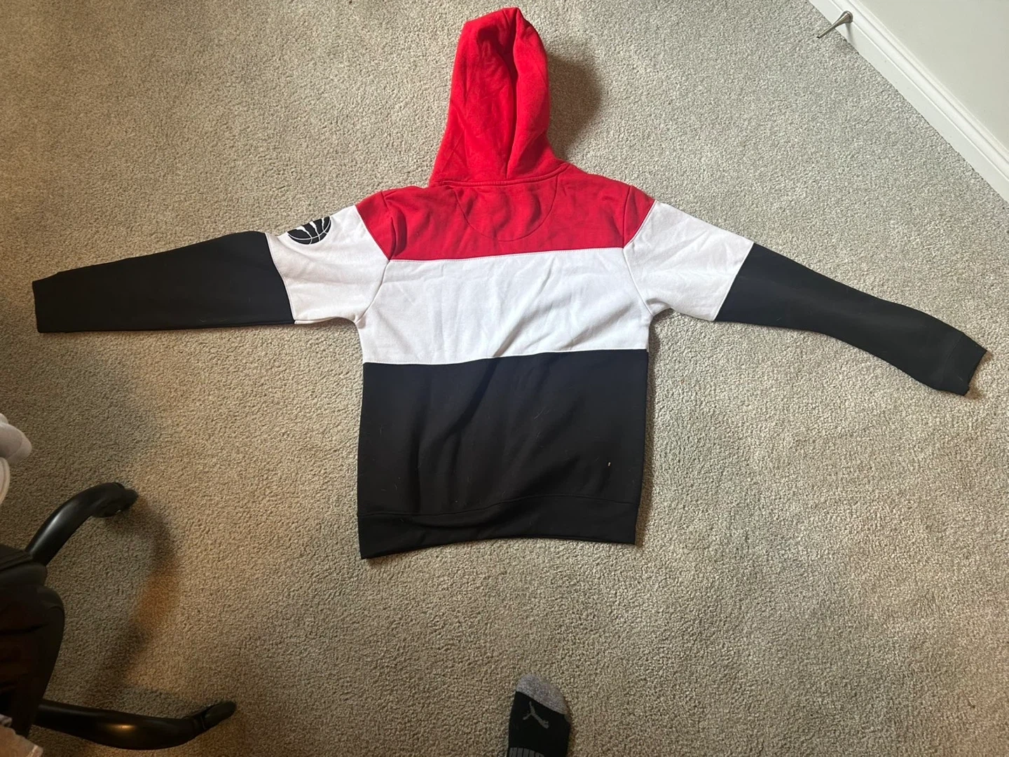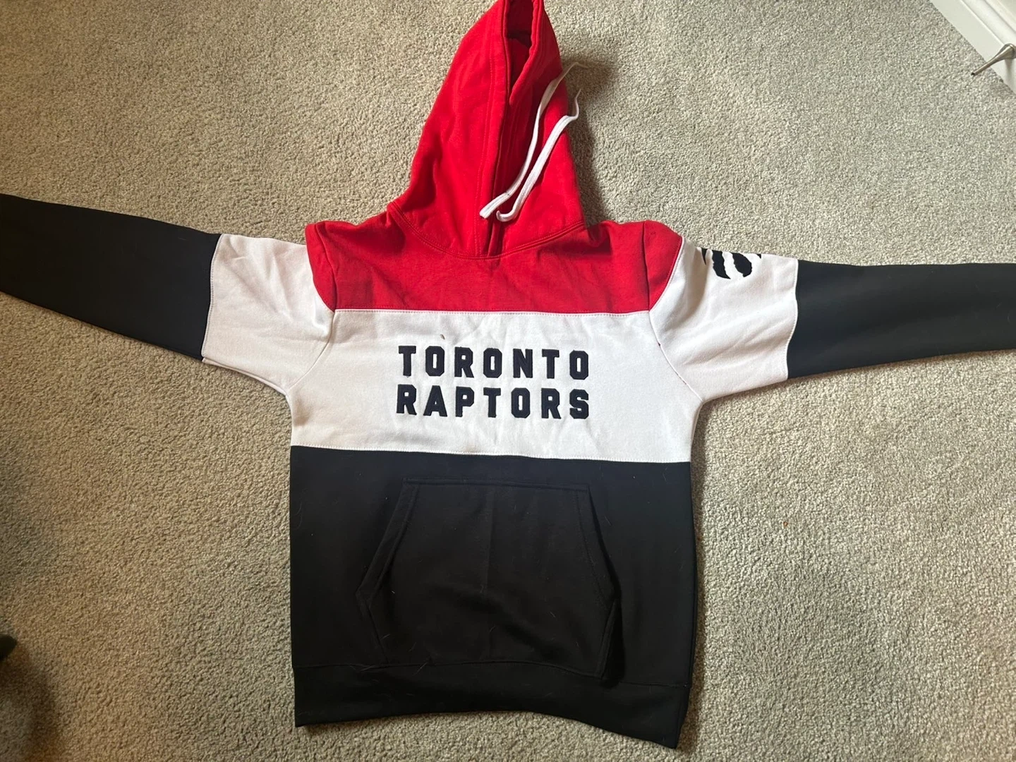 Selling a Toronto Raptors hoodie in size large. It features a red, white, and black colour block design.