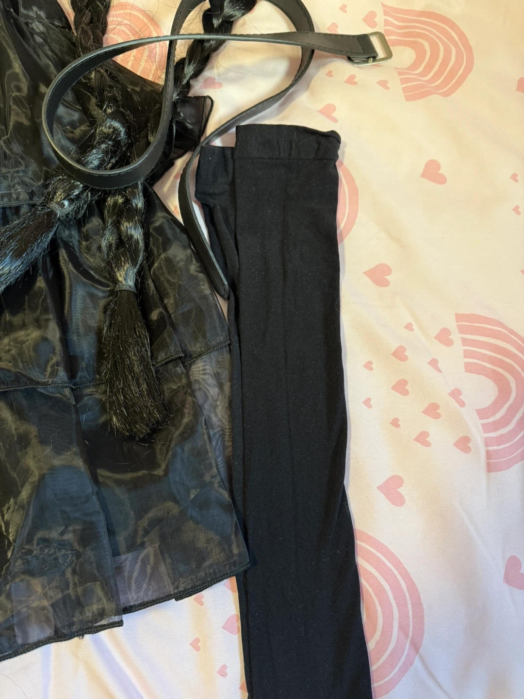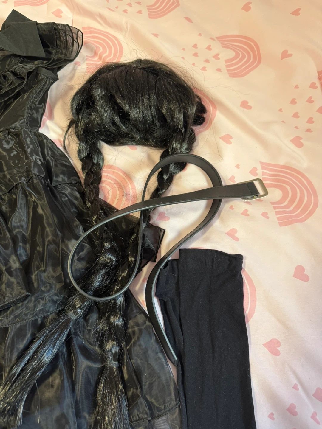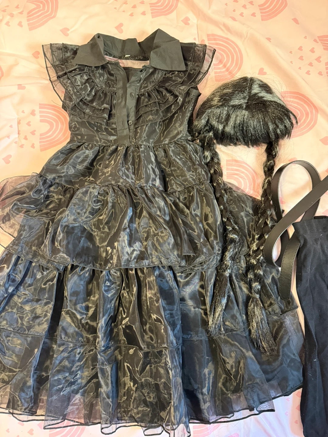 Selling a complete Wednesday Addams costume! It includes the dress, wig with braids, belt, and leggings. Perfect for Halloween or cosplay. The dress is a layered style and the wig is ready to go with neat braids. Everything is in great condition and ready for a new owner!