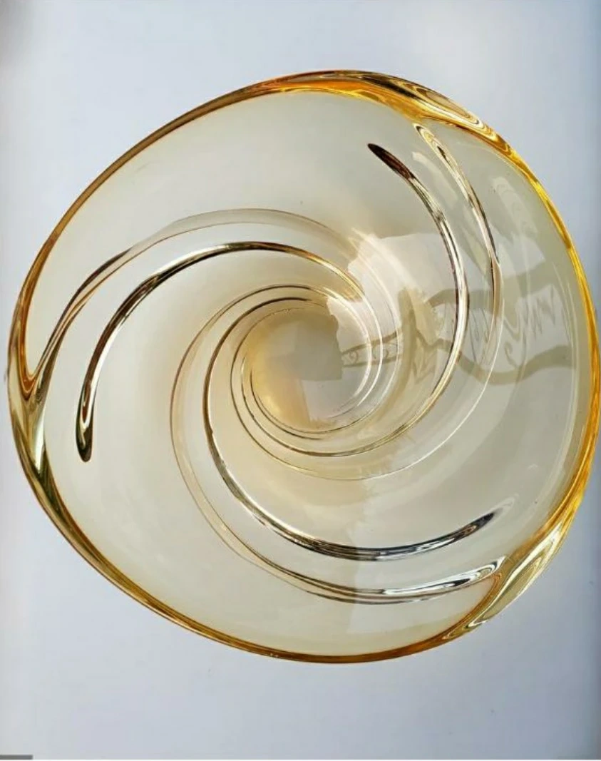 Selling a beautiful decorative amber glass bowl with a unique swirl design. Made by Chalet known as the ribbon line. It's in great condition and would make a lovely addition to any home. The amber colour catches the light beautifully, adding a touch of warmth to your space. Age appropriate bottom wear on this vintage item. firm price as these often fetch more. ty