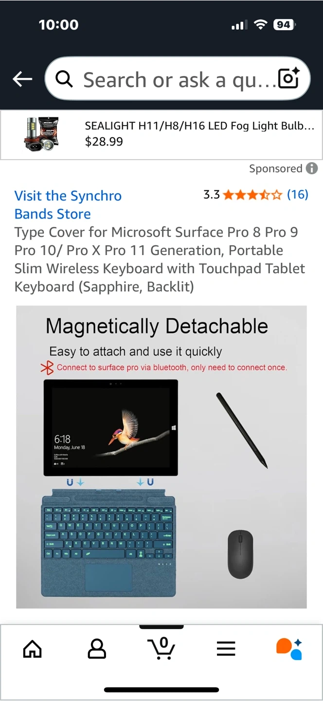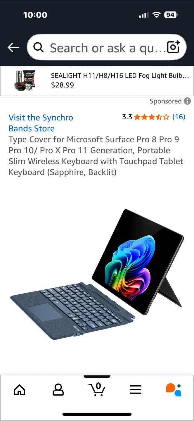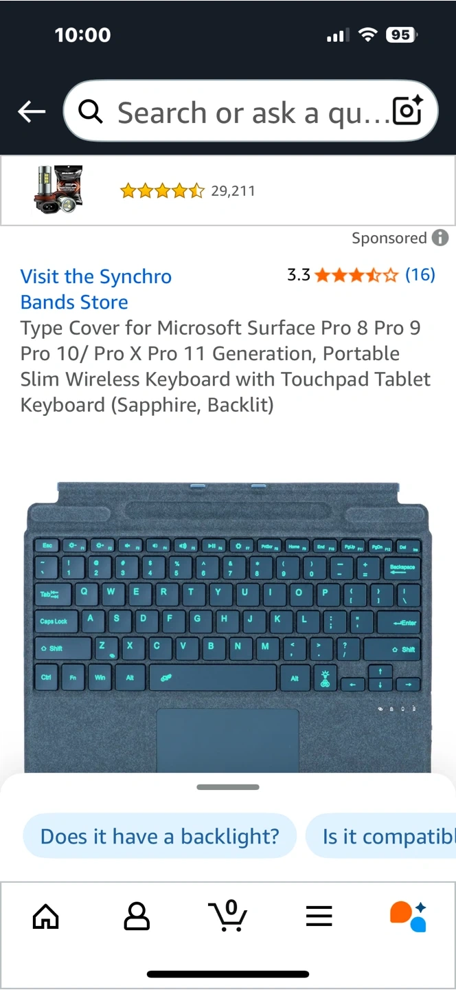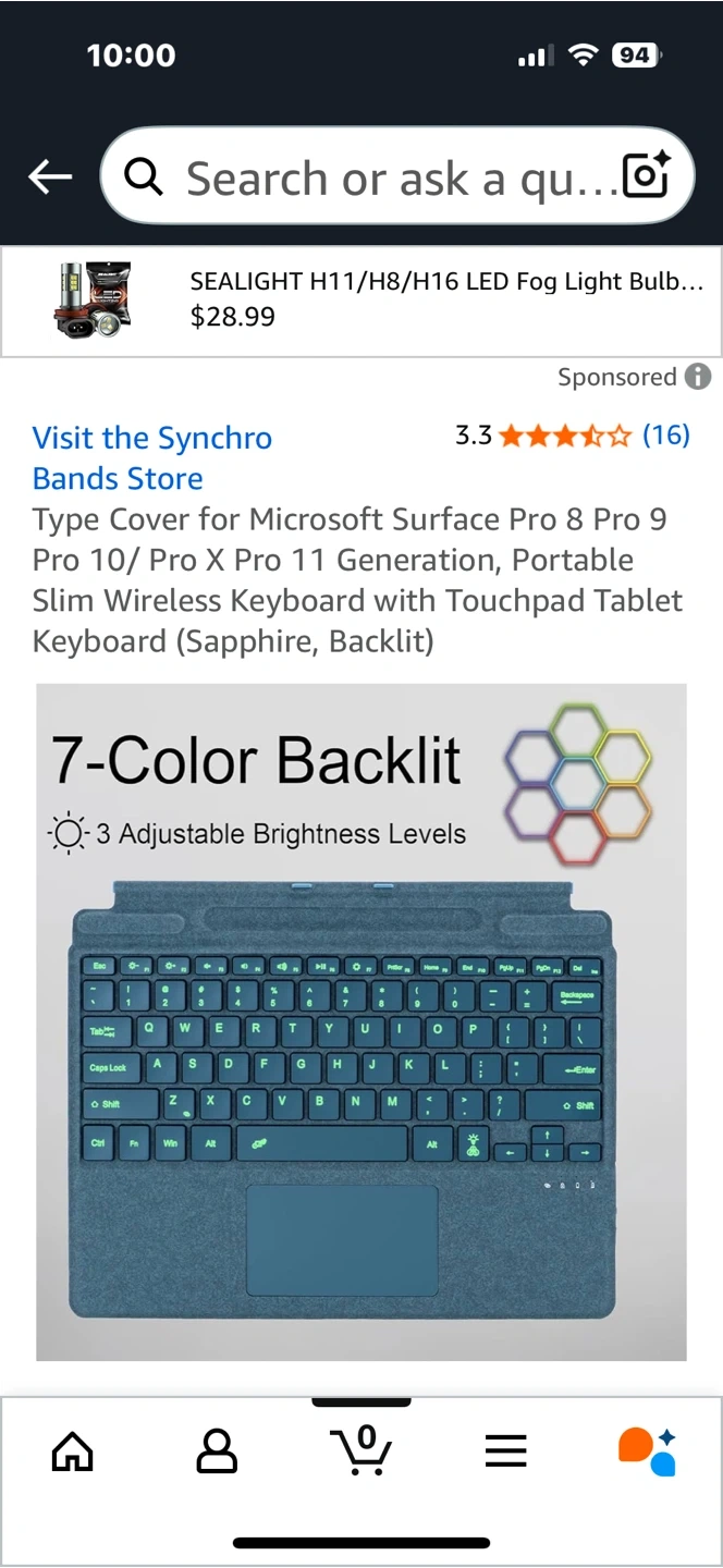 Looking to sell a Microsoft Surface Pro keyboard cover in Sapphire. It's compatible with Surface Pro 8, 9, 10, Pro X, and Pro 11 models. This portable slim wireless keyboard has a touchpad and 7-color backlight with 3 adjustable brightness levels. It's magnetically detachable, making it easy to attach and use quickly!