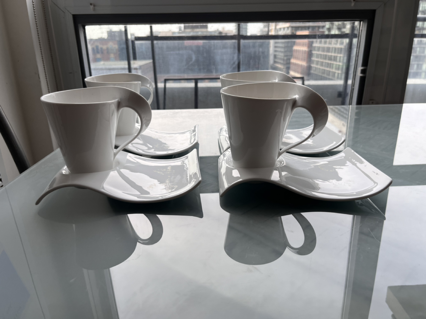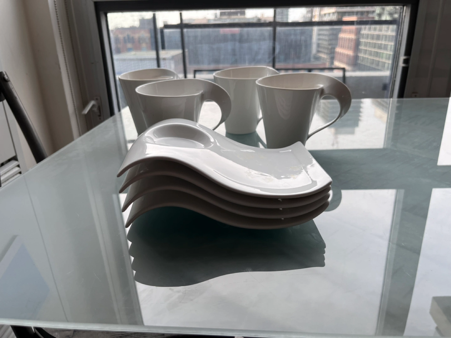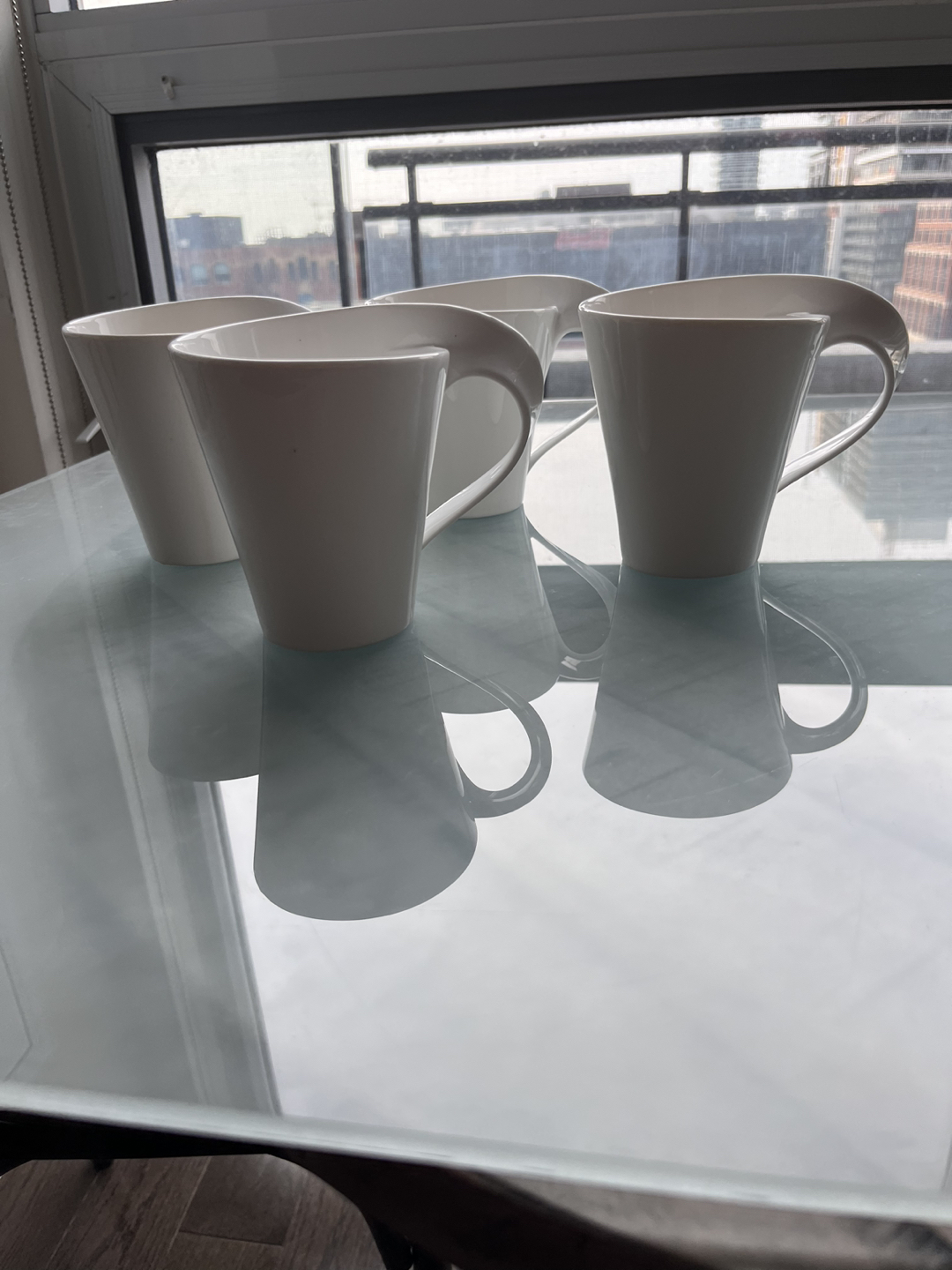 New Wave Caffe Mugs Set (4pc) Perfect for tea and a cookie! Great condition Pick up only. 2 Pick up options available! Day time pickup at Yonge & Bloor Evening pick ups at Sherbourne and Adelaide