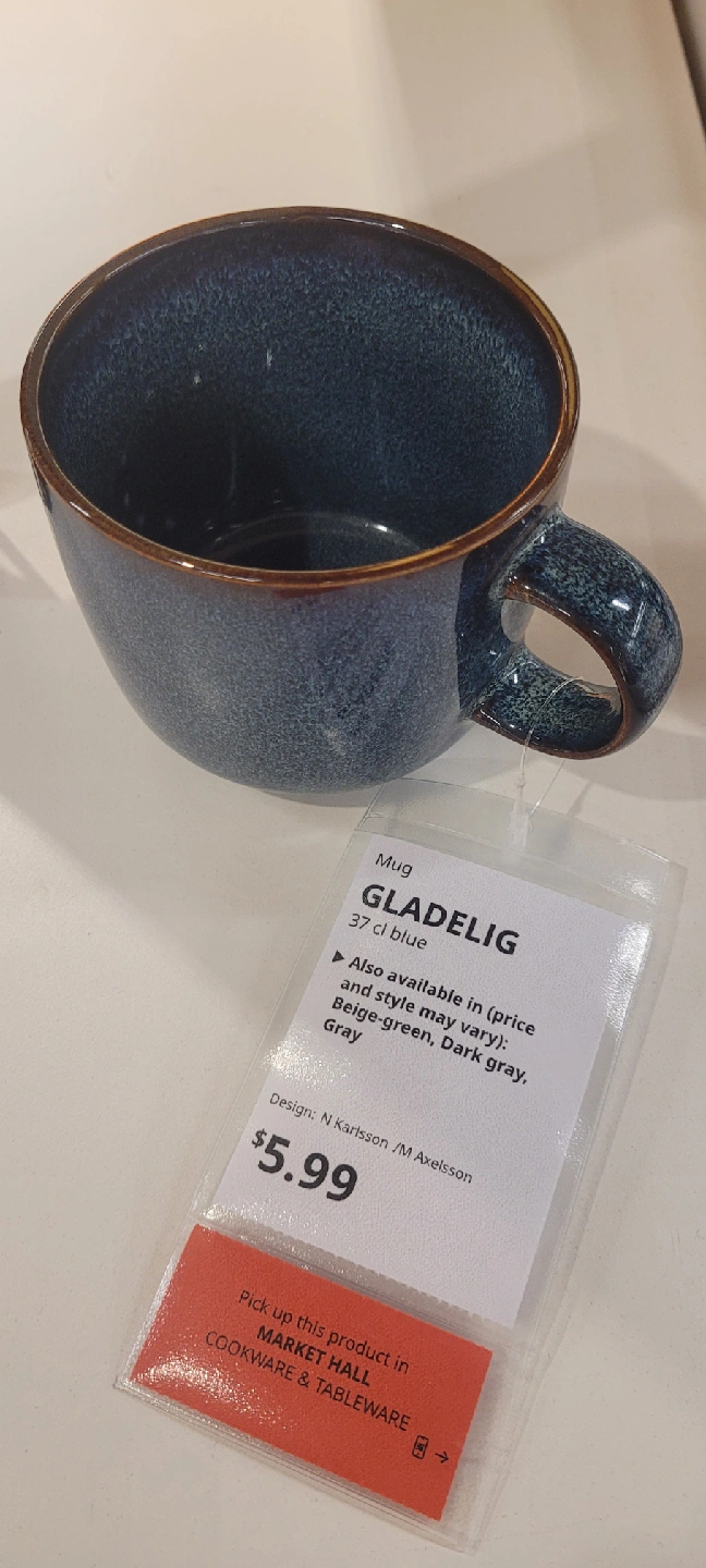 Selling a lovely blue IKEA GLADELIG mug! It holds 37 cl. The original price was $5.99. It's also available in beige-green, dark gray, and gray if you're looking for other colours Yonge and Finch area